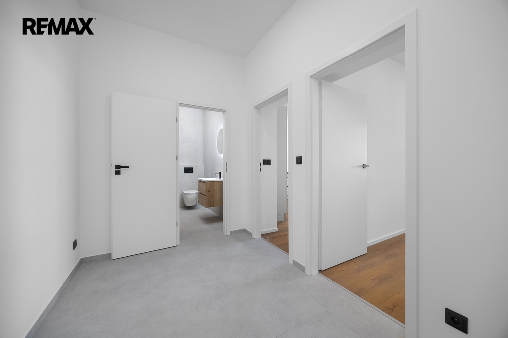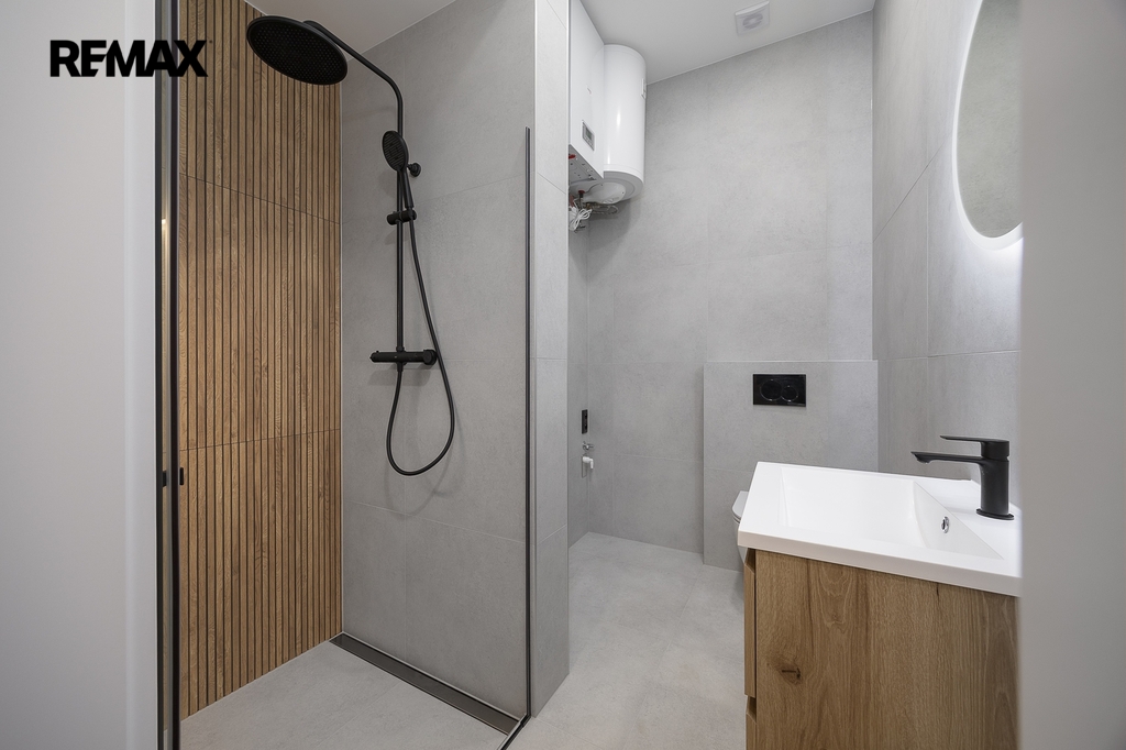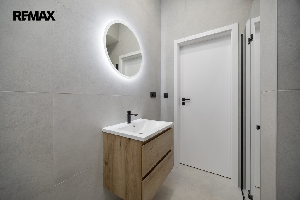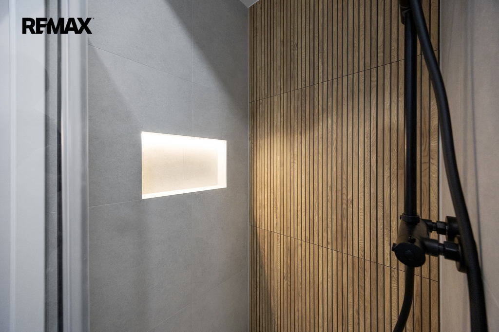 • moderní koupelnu s walk-in sprchou, podsvícenou nikou, velkoformátovou dlažbou 60 × 60 cm, závěsným WC Geberit, umyvadlem se skříňkou, podsvíceným zrcadlem a topným žebříkem