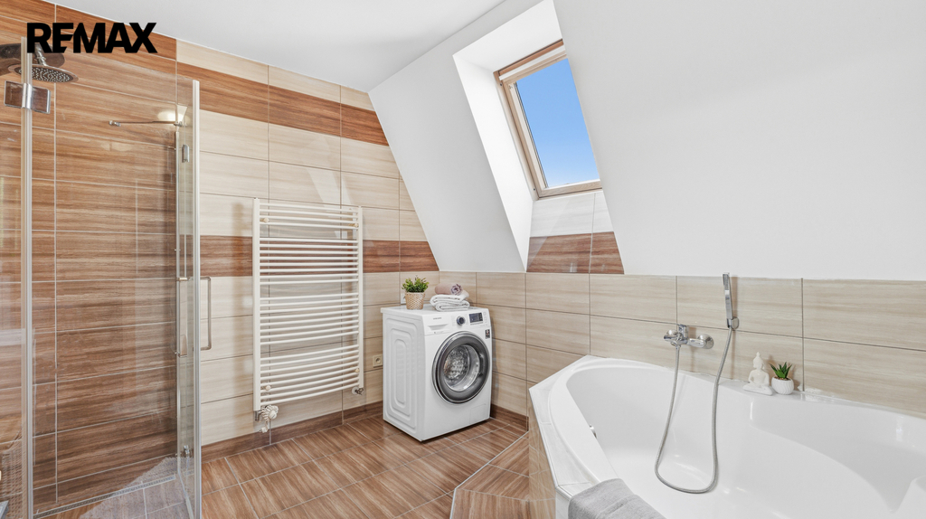 Horní bytová jednotka disponuje moderní kuchyňskou linkou s vestavěnými spotřebiči, včetně myčky nádobí a indukční varné desky. Koupelna je vybavena jak vanou, tak sprchovým koutem, což zajišťuje maximální komfort. Z obytné části je navíc vstup na prostorný balkon.