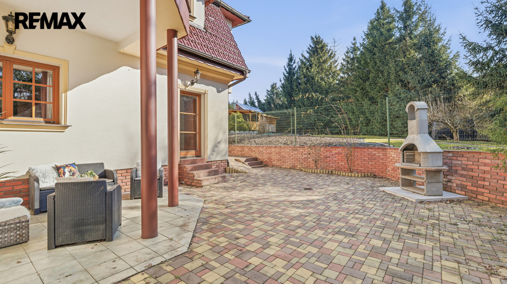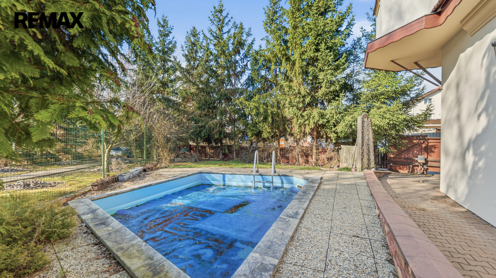 Součástí nemovitosti je garáž pro dvě auta, venkovní bazén 5x3 m a zabezpečovací systém s alarmem.