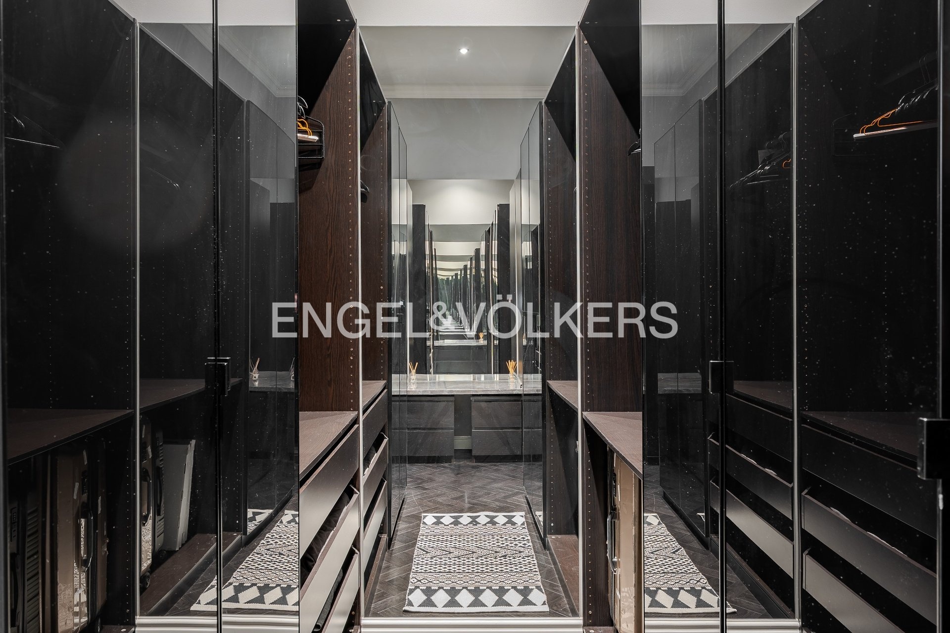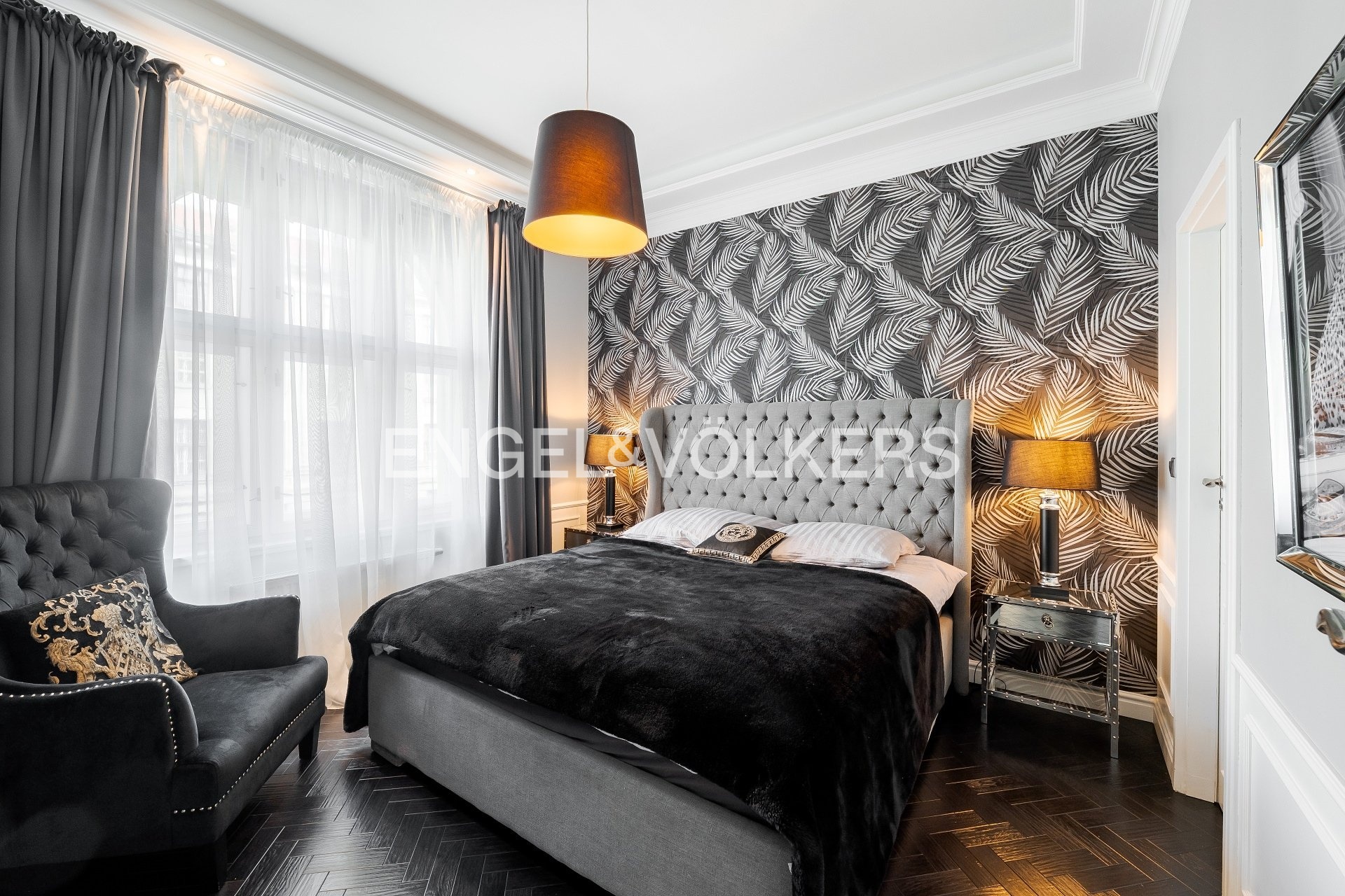 Interiér bytu tvoří světlý obývací pokoj s plně vybavenou kuchyňskou linkou a plynovým krbem, dále ložnice s vlastní šatnou a en-suite koupelnou se sprchovým koutem, samostatná toaleta a vstupní hala s množstvím vestavěných skříní. Byt je vybaven luxusním nábytkem a kvalitními spotřebiči – k dispozici je pračka, sušička, myčka, mikrovlnná trouba a dvě televize. Komfort bydlení zvyšují vinylové podlahy a moderní osvětlení na dálkové ovládání.