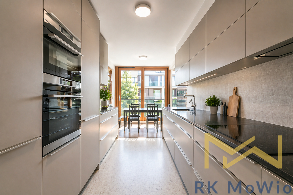 Dispozici bytové jednotky tvoří vstupní hala, vzdušný obývací pokoj a samostatná kuchyň s jídelnou. Z kuchyně i chodby je přístupný pokoj který je možný využít jako pracovna či pokoj pro hosty. Hlavní ložnice disponuje vlastní koupelnou (sprchový kout, umyvadlo, toaleta). Byt dále nabízí dvě další ložnice, druhou koupelnu (vana, dvě umyvadla, toaleta), komoru vhodnou pro umístění pračky a sušičky a samostatnou toaletu pro hosty. Dispozice poskytuje dostatek prostoru pro komfortní rodinné bydlení i reprezentativní zázemí. Vybavení bytu zahrnuje plně vybavenou kuchyňskou linku (lednice s mrazákem, sklokeramická varná deska, digestoř, myčka, vestavěná elektrická a mikrovlnná trouba), vestavěné skříně, klimatizaci, přípravu pro pračku a sušičku, velkoformátová okna a exteriérové stínění.