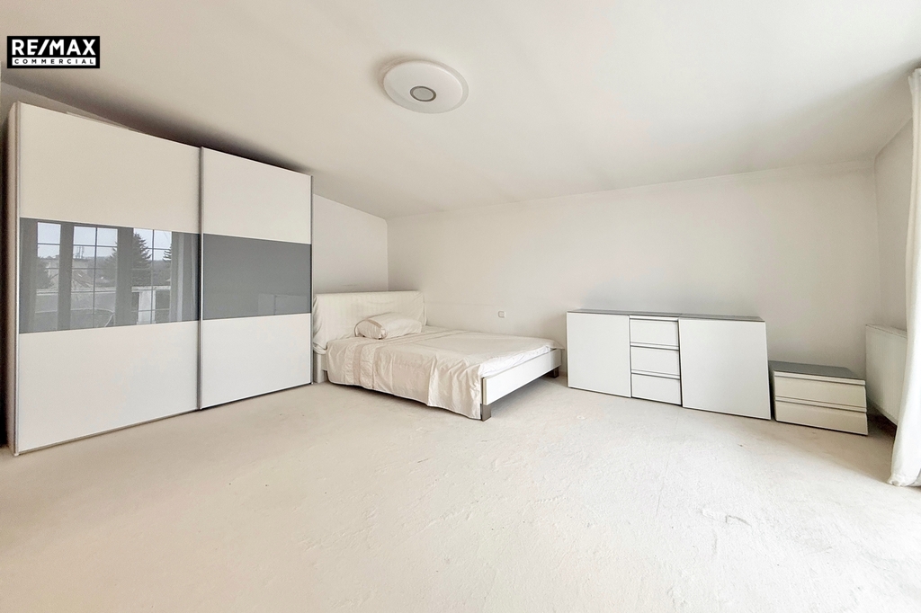 V patře se nacházejí dvě ložnice s balkony, jedna, hlavní s vlastní koupelnou, další pokoj, otevřená pracovní galerie s knihovnou. Celkem dům disponuje třemi koupelnami.