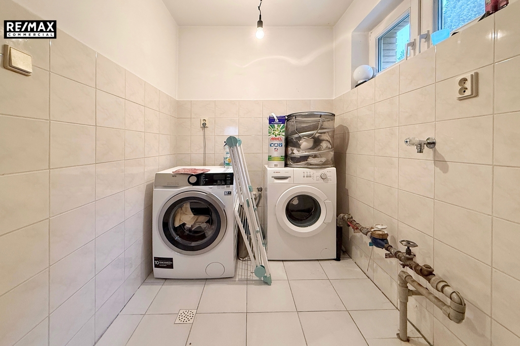 Suterén nabízí kompletní technické zázemí a dostatek úložných prostor. Samozřejmostí je dvougaráž a další čtyři parkovací místa na pozemku.