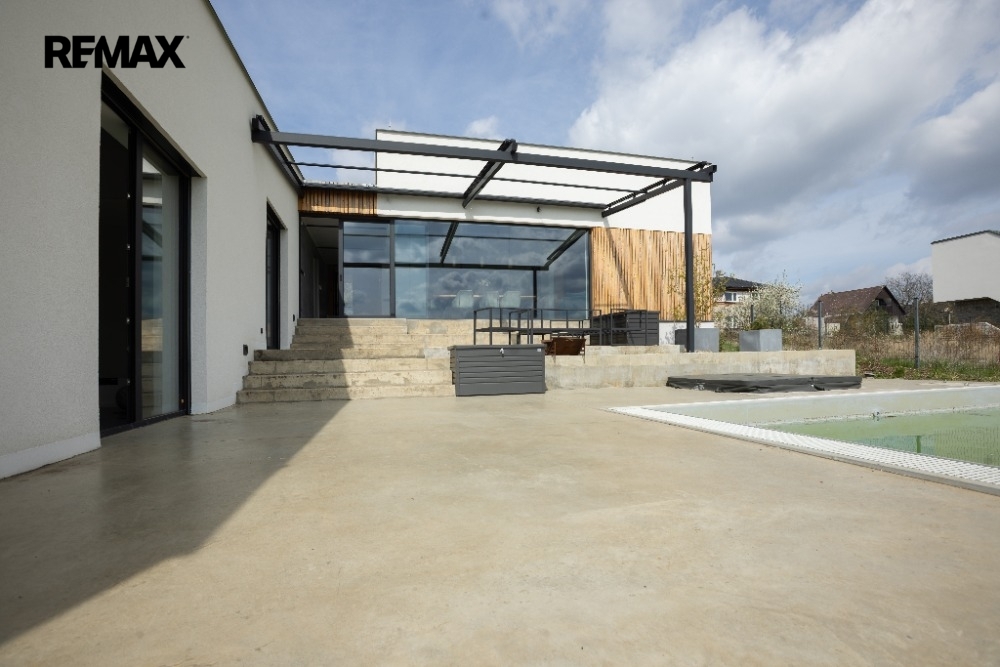 Terasy mají elektricky ovládané zastínění a zapuštěný přelivový bazén 6x3 s vyjíždějí krycí nosnou lamelou a vířivku, vše od firmy BWT.