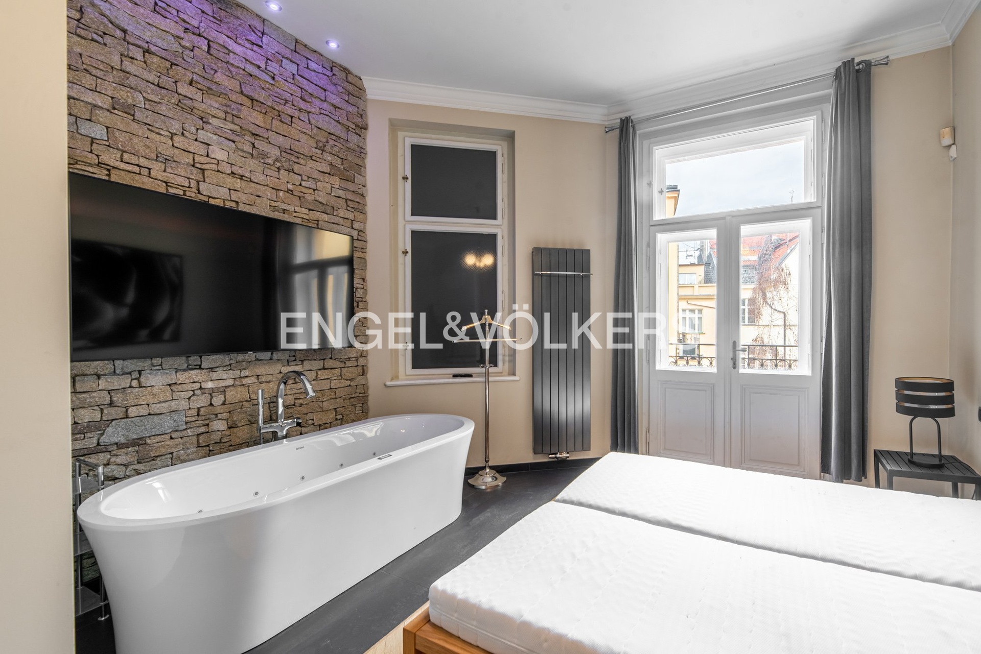 Byt se nachází ve čtvrtém nadzemním podlaží zrenovovaného secesního domu s moderním výtahem přímo v srdci historického centra Prahy. Interiér kombinuje původní architektonické prvky s důrazem na kvalitu materiálů, historický charakter a moderní technologie.