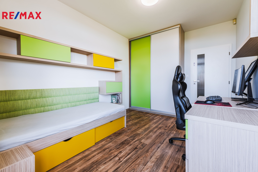Ložnice se vstupem na balkon a vestavěnou skříní