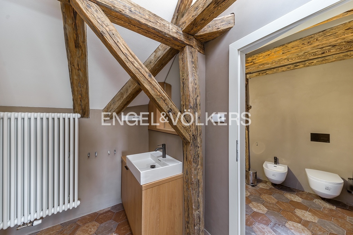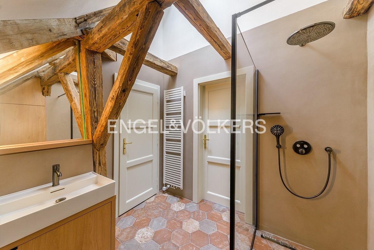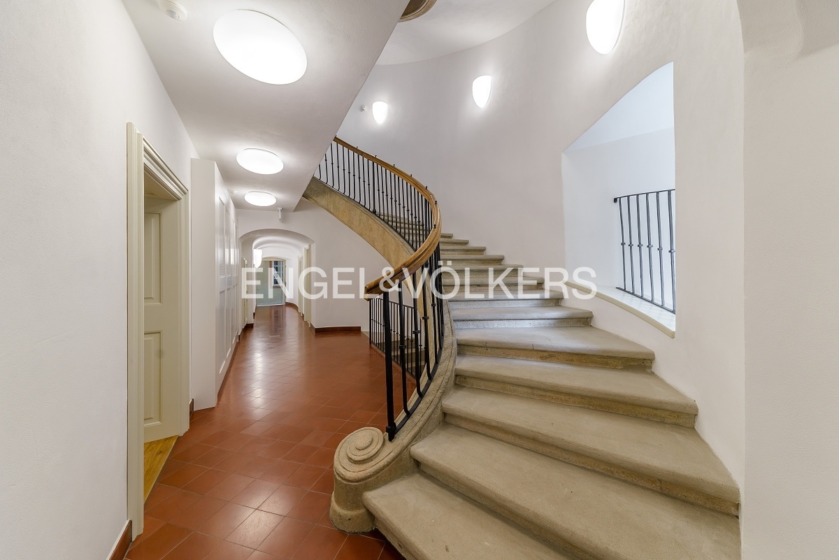 Unikátní dispozice se samostatnou ložnicí s vestavěnými skříněmi a en-suite koupelnou, velkorysým obývacím pokojem s plně vybavenou kuchyní na míru se spotřebiči Miele a krásnými výhledy na Karlův most a Vltavu.