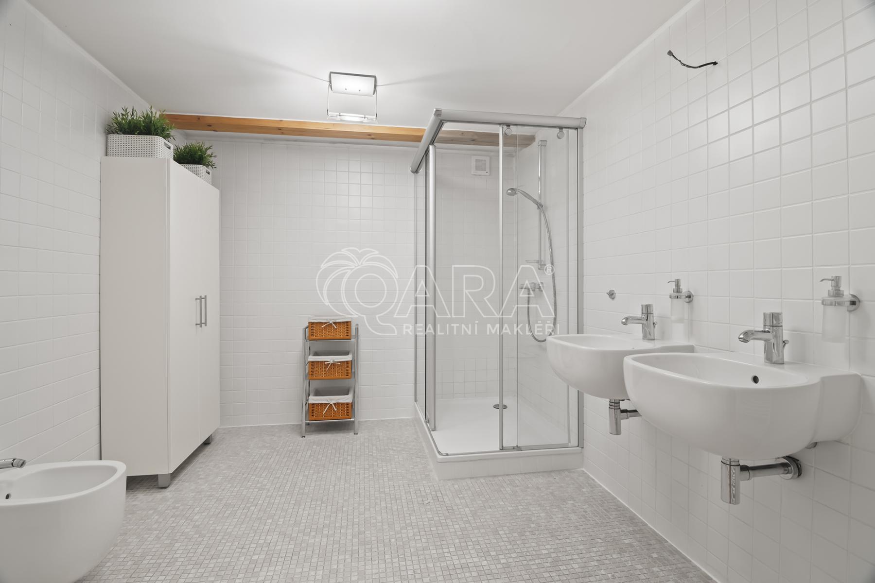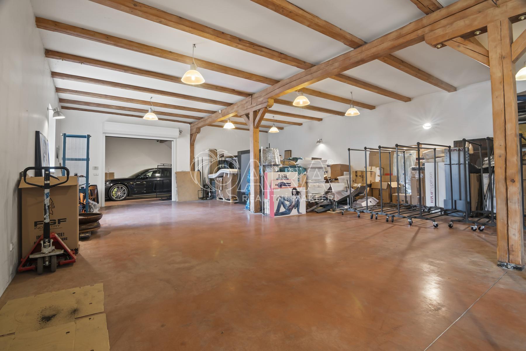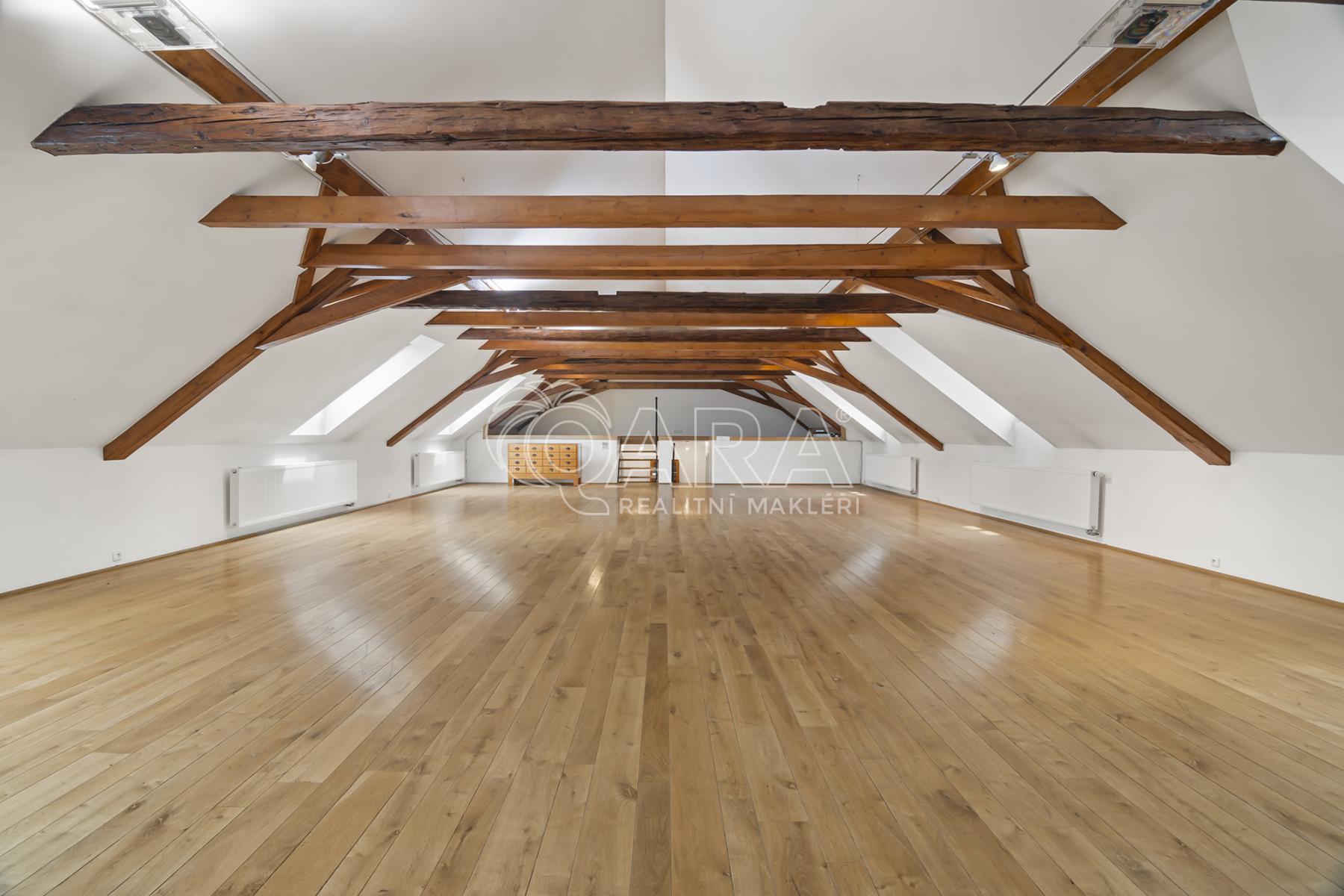 Celková podlahová plocha činí 469,5 m2 ve dvou podlažích. Přízemí o velikosti 221 m2 je řešeno jako skladový prostor s možností přímého vjezdu, zatímco horní podlaží o výměře 248,5 m2 tvoří otevřený a reprezentativní prostor vhodný pro showroom, kanceláře nebo ateliér. Díky konstrukčnímu řešení krovu bez podpěrných sloupů je prostor maximálně variabilní a vzdušný.