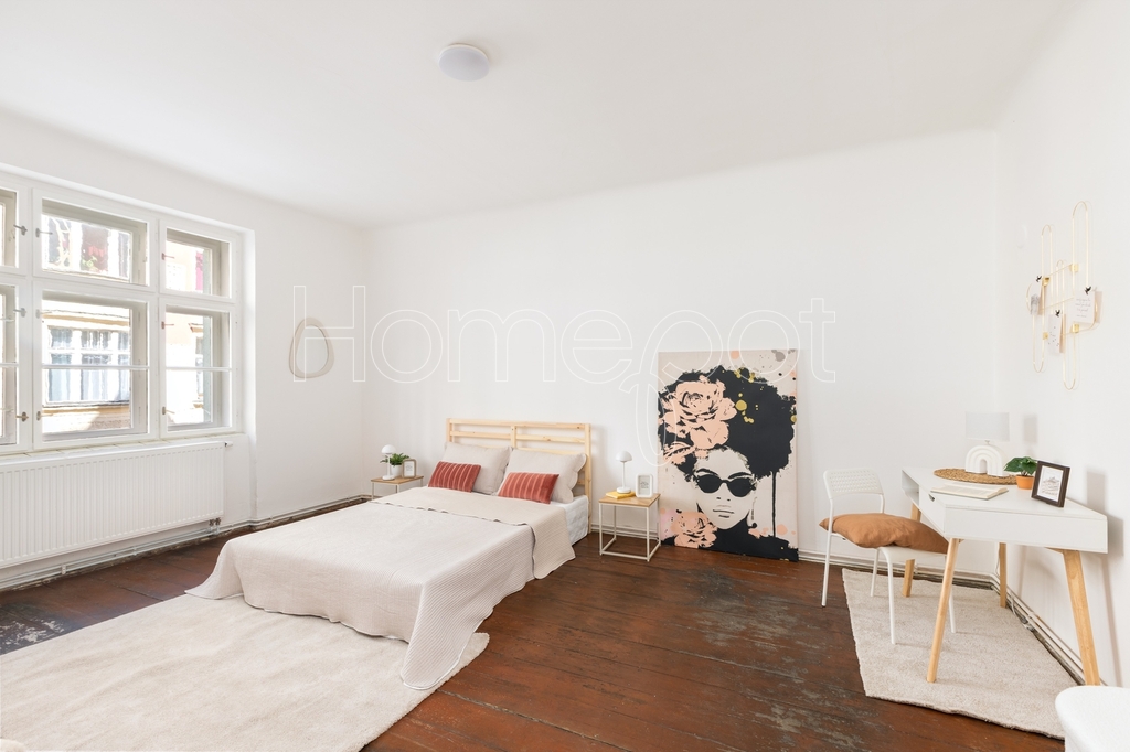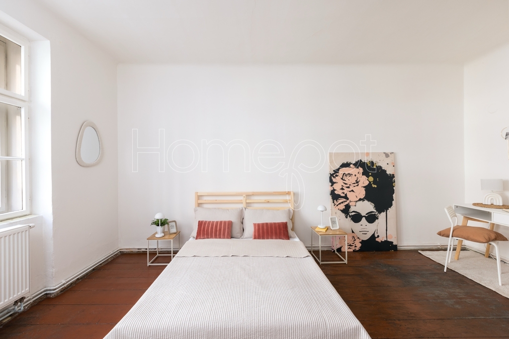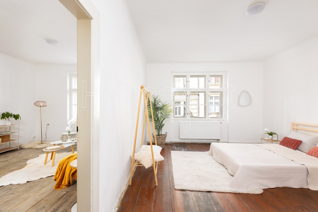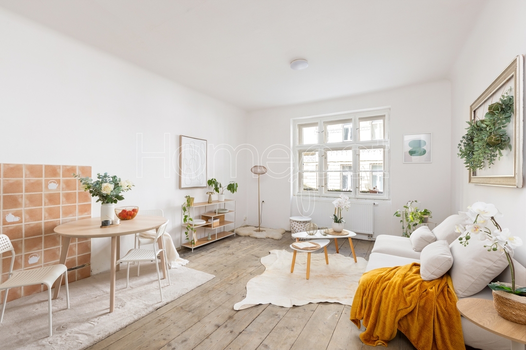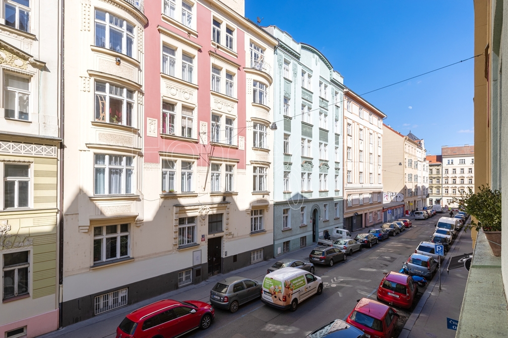 Tento velmi světlý byt, kde světlo během dne dělá svoji práci – ráno je jiné než odpoledne – se nachází ve 2. nadzemním podlaží historického činžovního domu v ulici Jirečkova, v jedné z nejživějších částí Prahy 7. Podlahová plocha činí 53,1 m².
