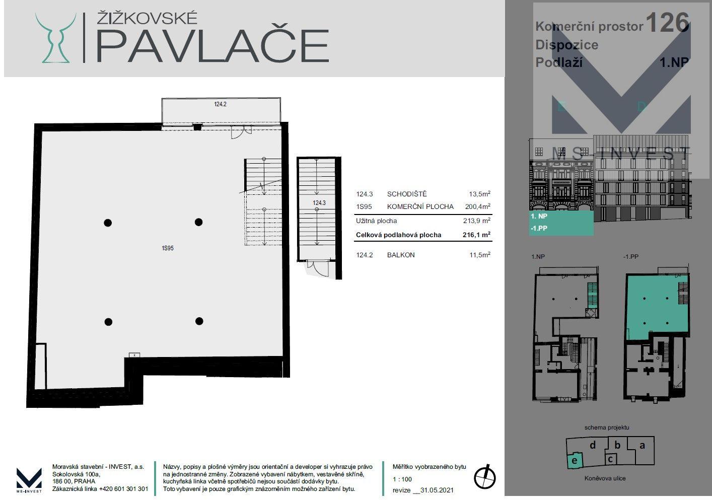Obchodní prostor s terasou, 216 + terasa 12 m2, v novostavbě projektu Žižkovské pavlače, Praha 3