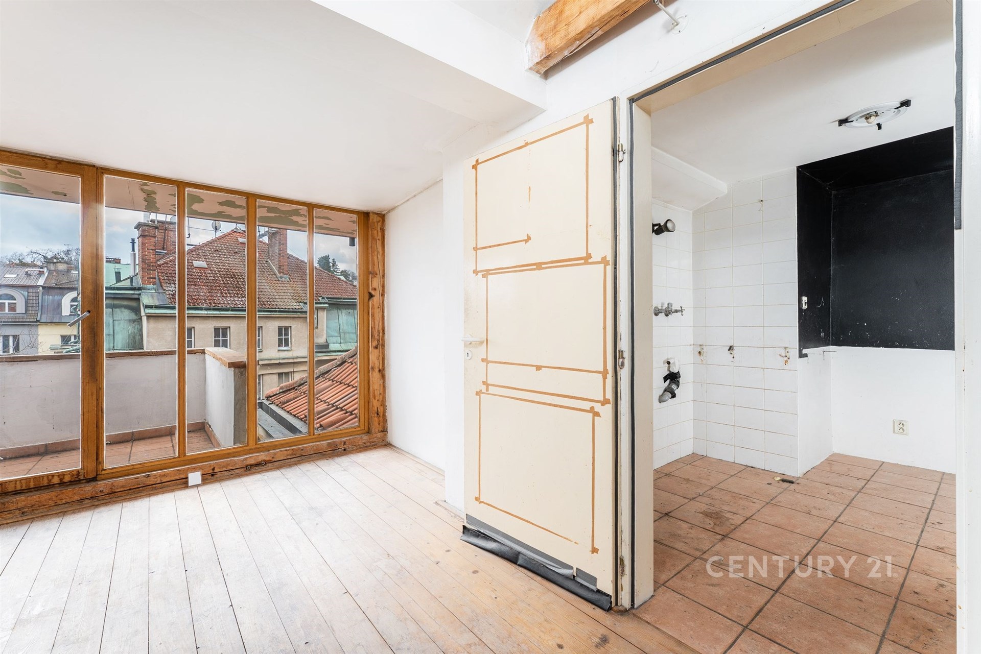 Podkrovní charakter ateliéru vytváří neopakovatelnou atmosféru s množstvím světla a zajímavými průhledy. Tento prostor přímo vybízí k citlivé rekonstrukci, díky které si nový majitel může vytvořit skutečně osobité bydlení bez kompromisů.
