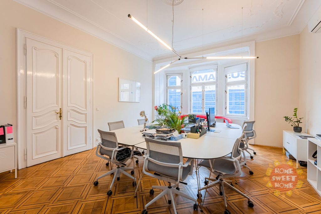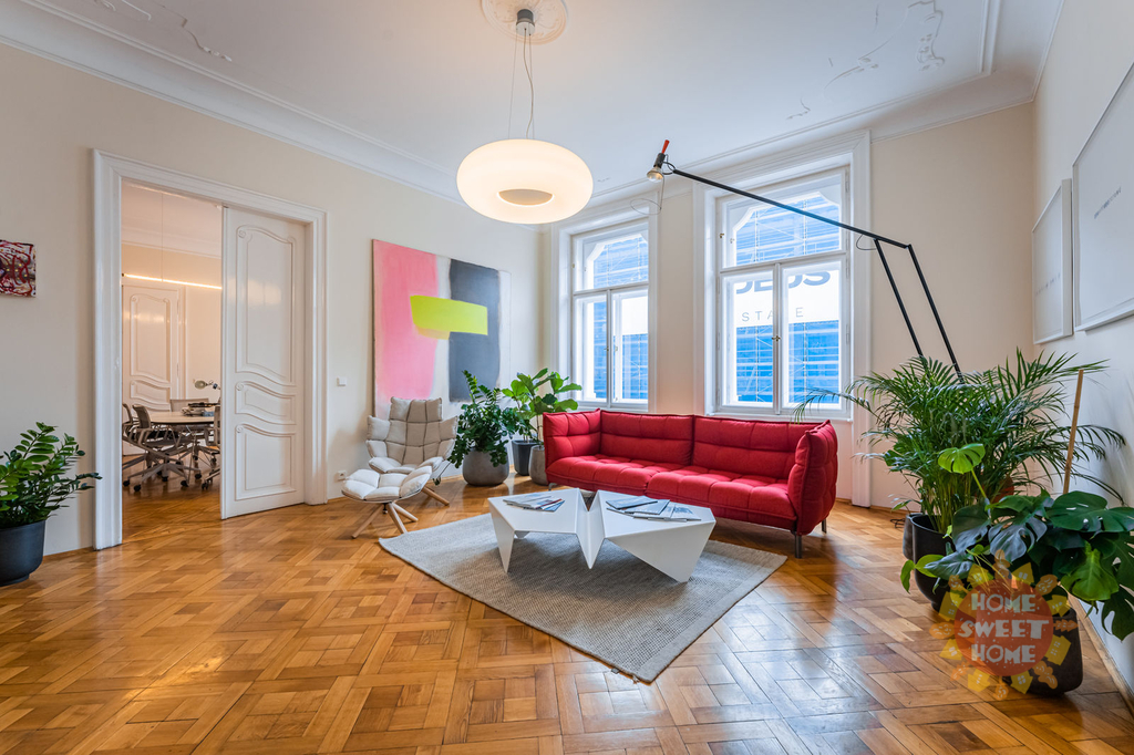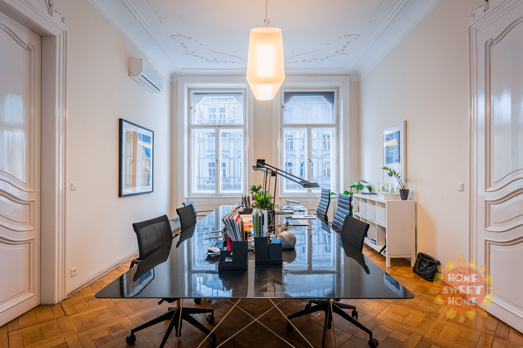 Prostory se skládají z příjímací haly, chodby, 6 samostatných místností, další 2 průchozí místnosti, denní místnost lze využít jako zázemí pro zaměstnance + menší sklad, 5 x toaleta, koupelna a čajová kuchyňka, 2 x balkon. Vysoké stropy a dřevěné parkety - to vše podtrhuje historický avšak moderní ráz kanceláře. Prostory jsou orientované do ulice Na Perštýně a Národní