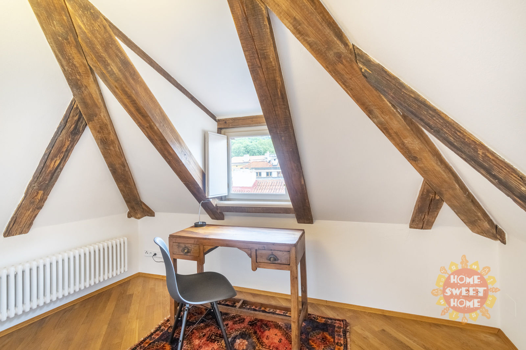 Dovolujeme si Vám nabídnout k pronájmu kompletně zařízený byt 4+1 s výjimečnou, nezaměnitelnou až magickou atmosférou, ve třetím patře neuvěřitelně krásného historického domu s výtahem ( byt má vlastní vstup do výtahu). S kouzelným přístupem přes téměř rajský dvoreček, s krásnými stromy a fontánkou.