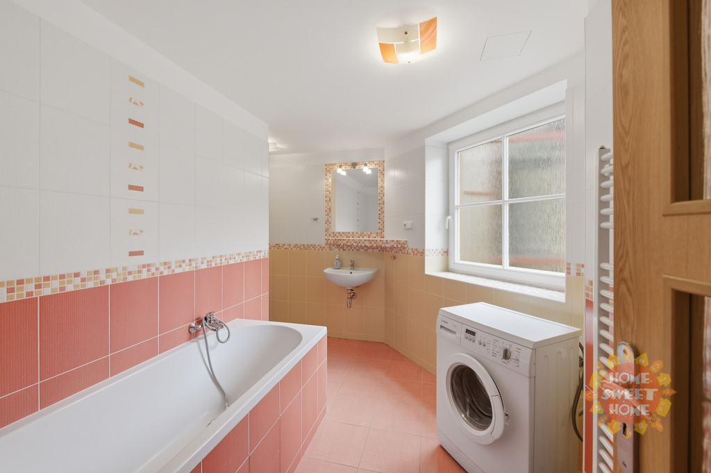 menší vstupní chodba, obývací pokoj s kuchyňskou linkou vybavená všemi spotřebiči (sklokeramická deska, trouba, myčka, mikrovlnka a lednice), ložnice, koupelna s vanou, toaletou a pračkou. Plovoucí podlahy a dlažba, topení zajišťuje vlastní plynový kotel a k dispozici je sklep. Nové fotografie se připravují.