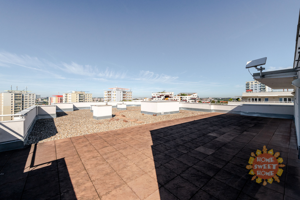 Byt je navržen tak, aby splnil potřeby rodin. Byt je částečně vybavený a sestává ze vstupní chodby, šatny, dvou světlých prostorných ložnic a jednoho dětského pokoje, který lze případně upravit na pracovnu, dvou koupelen s toaletou (sprchový kout a vana), prostorného obývacího pokoje s francouzskými okny a vybaveným kuchyňským koutem (myčka, vestavná lednice s mrazničkou, elektrická varná deska a vestavná pečící trouba). Všechny pokoje mají vlastní vstup na rozlehlou střešní terasovou plochu s krásným panoramatickým výhledem do širokého okolí. Terasa o rozloze neuvěřitelných 150 m² poskytuje ideální místo pro rodinné posezení či grilování v teplých měsících.