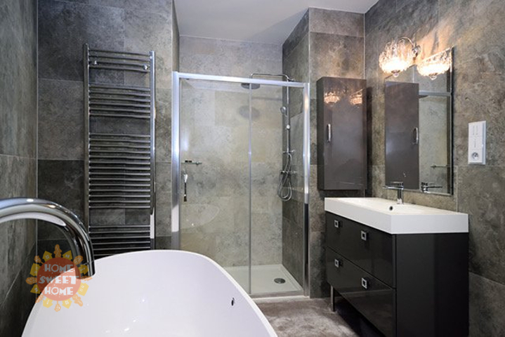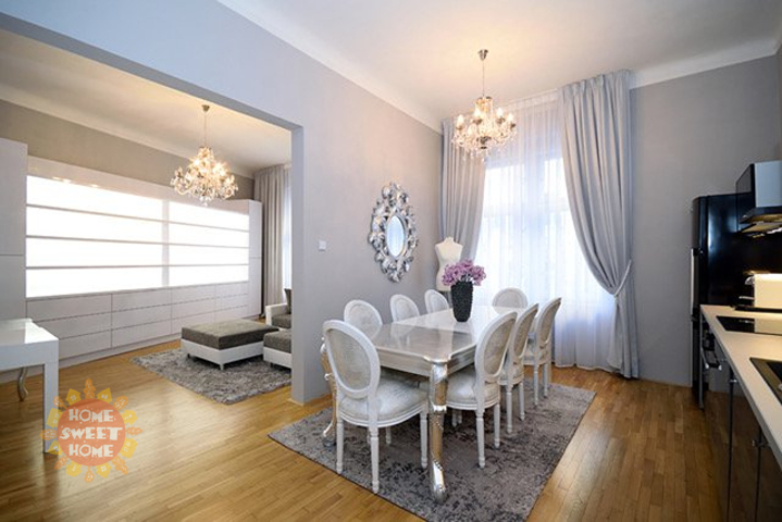 Byt o rozloze 80 m2 se nachází v prvním patře a je kompletně vybavený designovým nábytkem od firmy Kare, Nobis, Swarowski.