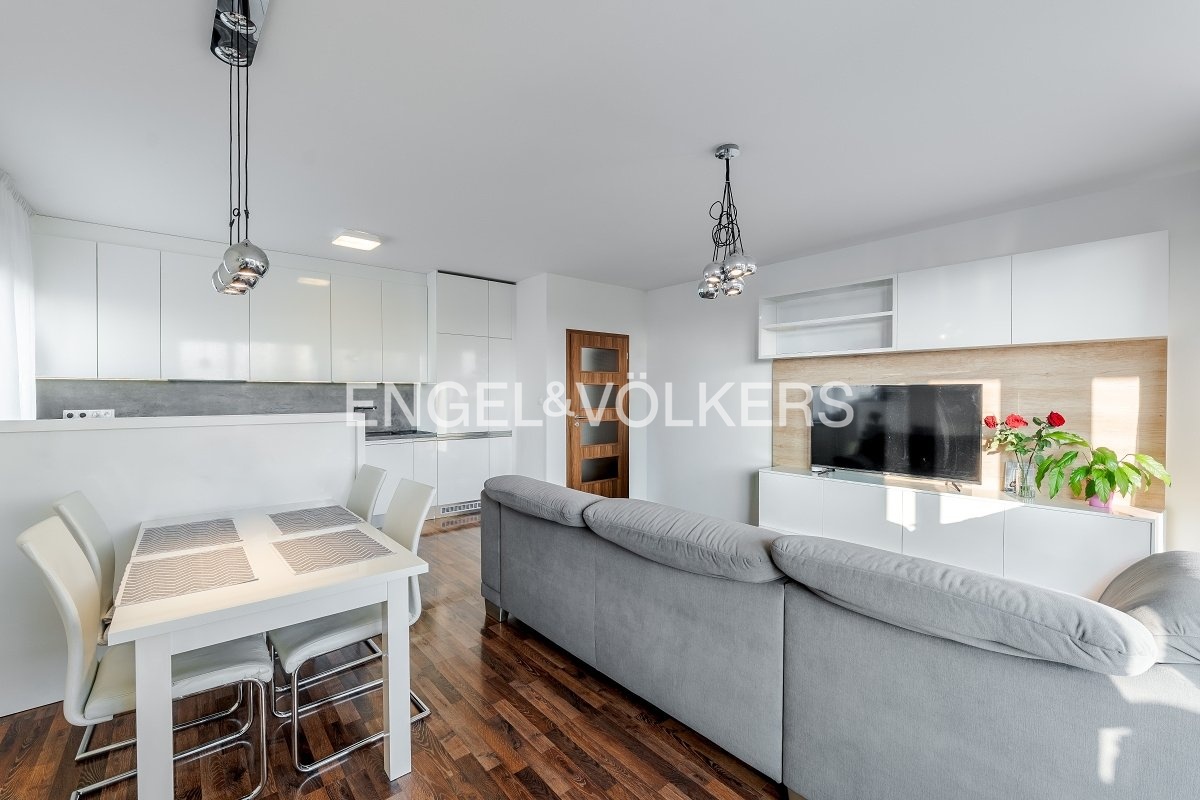 Obývací část je propojena s kuchyňským koutem a navazuje na prostorný balkon o velikosti 17 m² s jižní orientací, která zajišťuje dostatek denního světla po celý den. Na balkon lze vstoupit i z první ložnice (dětského pokoje). Byt je vybaven klimatizací v obývacím pokoji a dětském pokoji. Okna jsou plastová s dvojskly. Vytápění je řešeno centrálním plynovým systémem.
