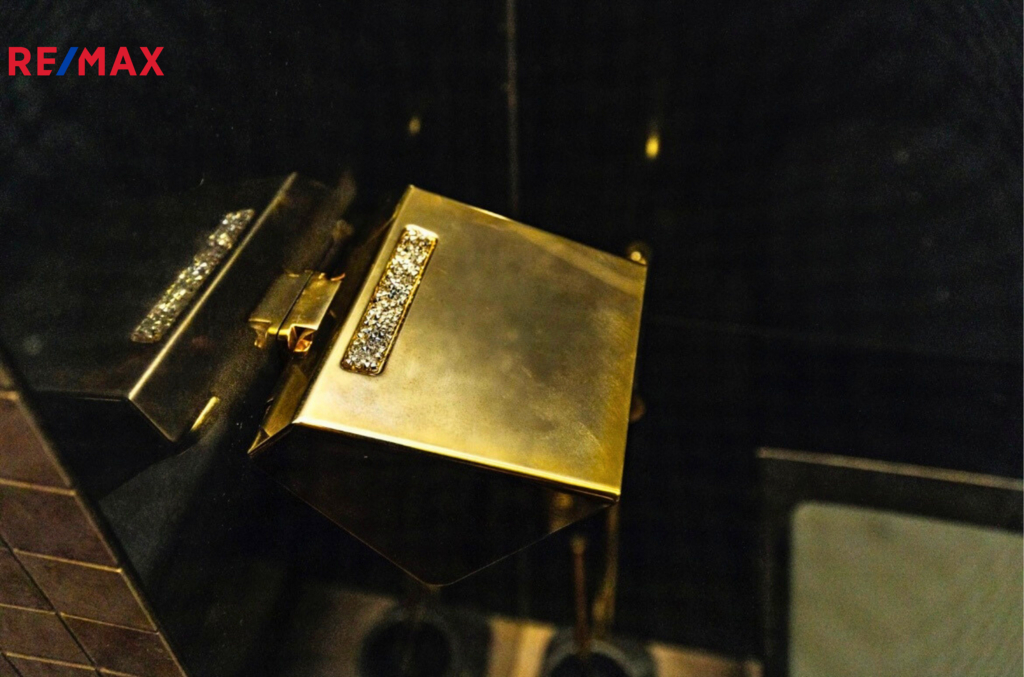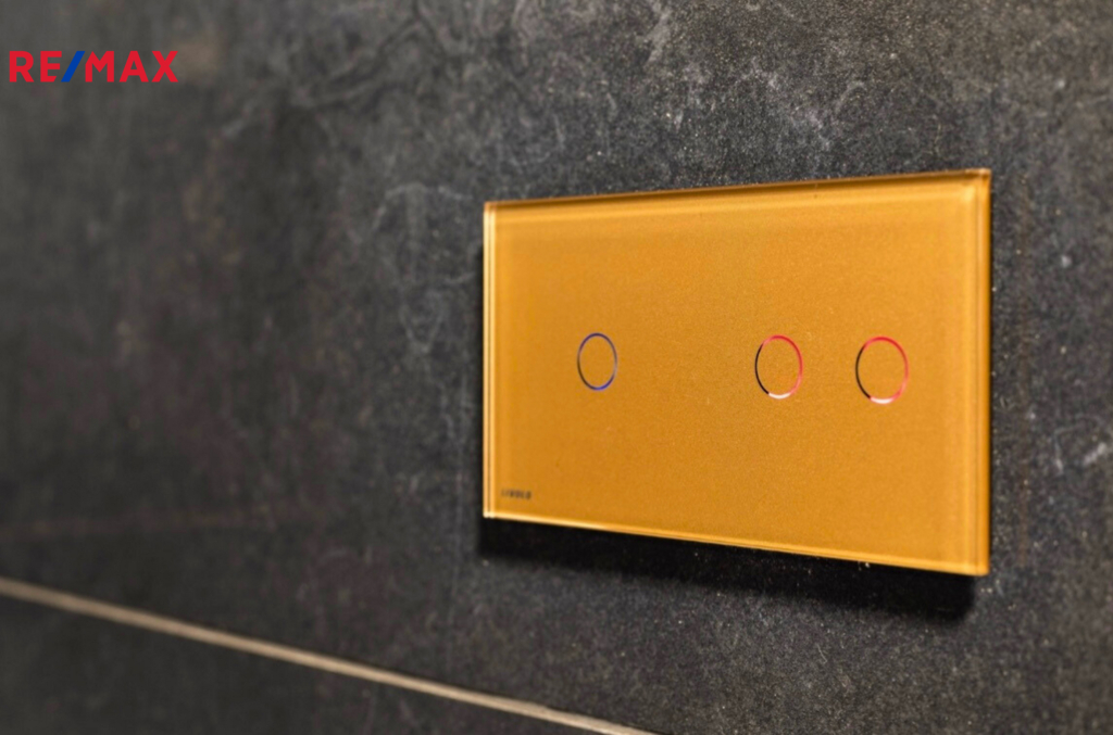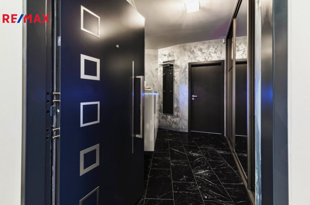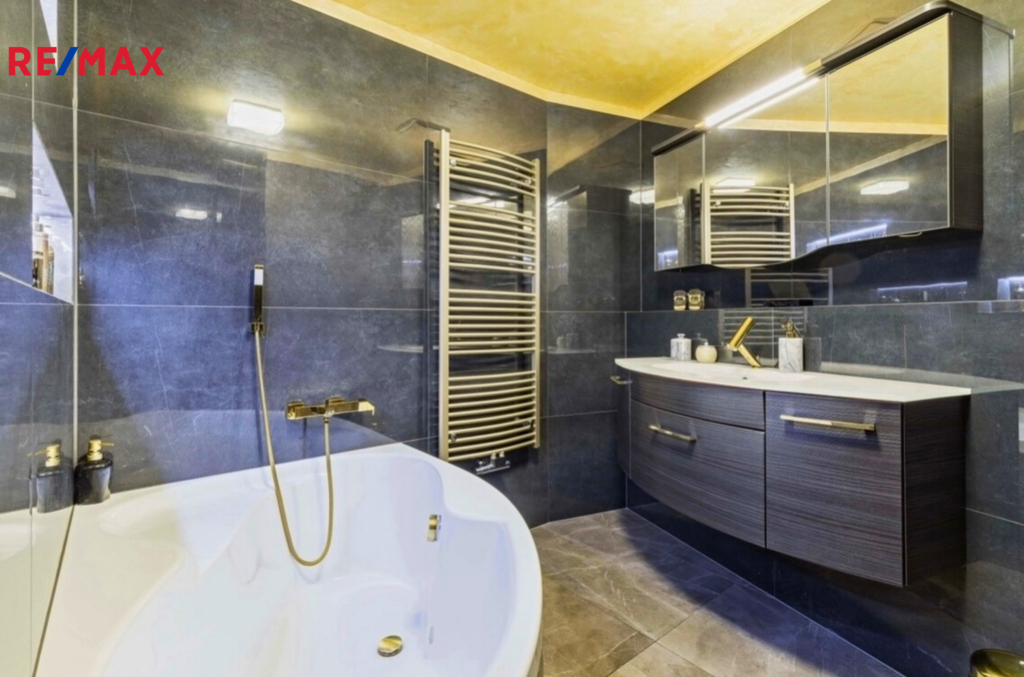 Samozřejmostí jsou nadstandardní materiály: lesklé benátské štuky, italský mramor v předsíni, rozsáhlá skleněná skříň se zrcadlem, skleněné dotykové vypínače a zásuvky. Antracitová koupelna s podsvícenými nikami a rohovou vanou je skutečnou třešničkou na dortu.
