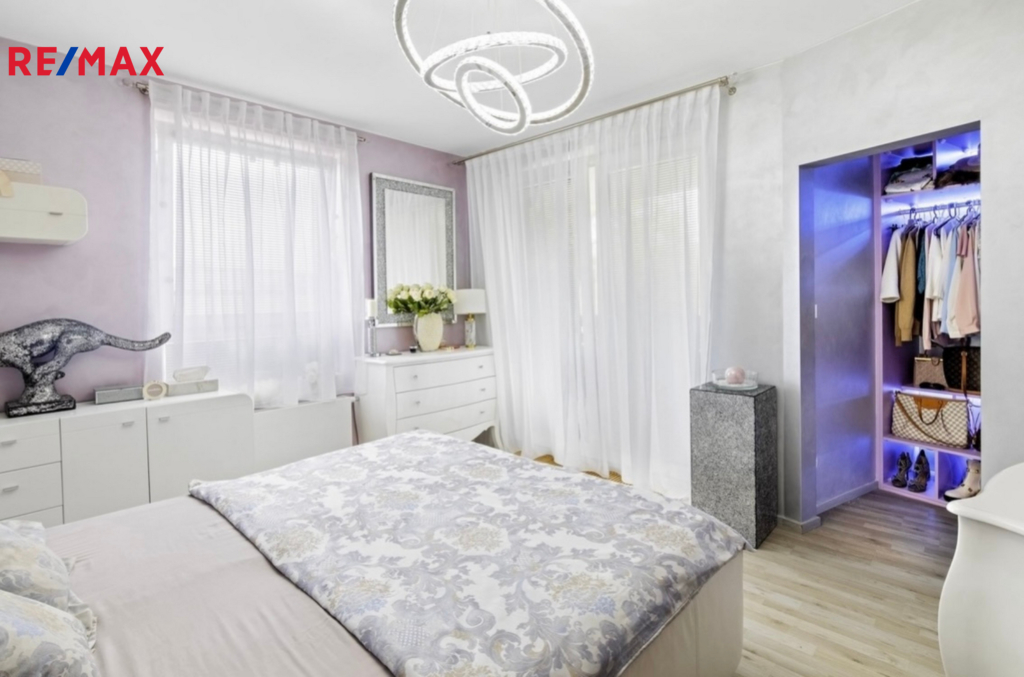 Další dvě ložnice nabízí komfortní čtvercový půdorys pro snadné zařízení nábytkem. Větší z ložnic má vstup na menší terasu a vestavěnou šatnu v originální lila barvě.