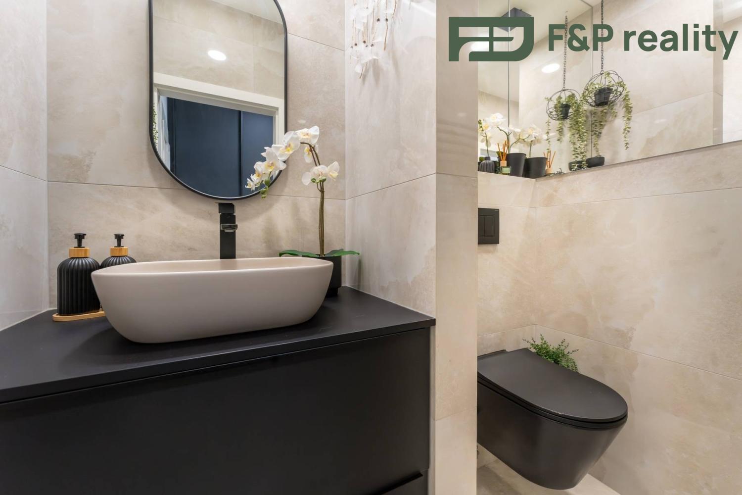 Praktická dispozice: Dvě samostatné toalety a prostorná technická komora pro pračku a sušičku.