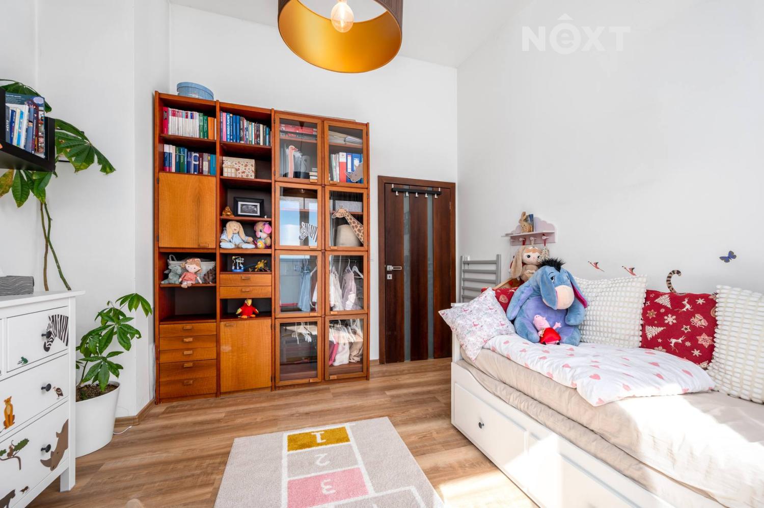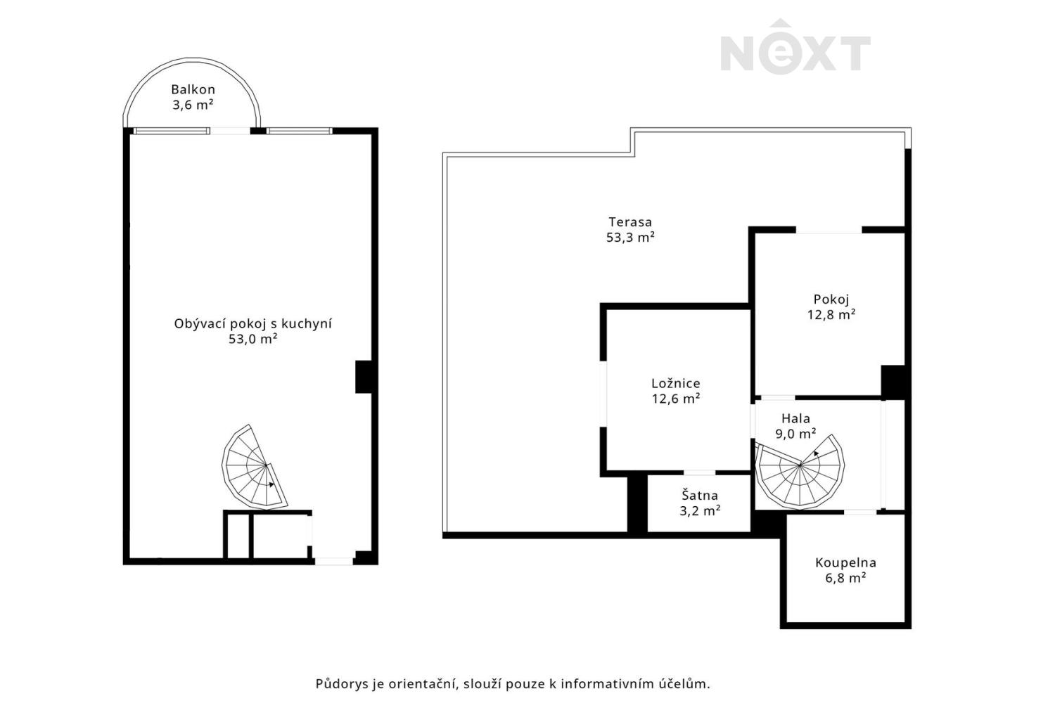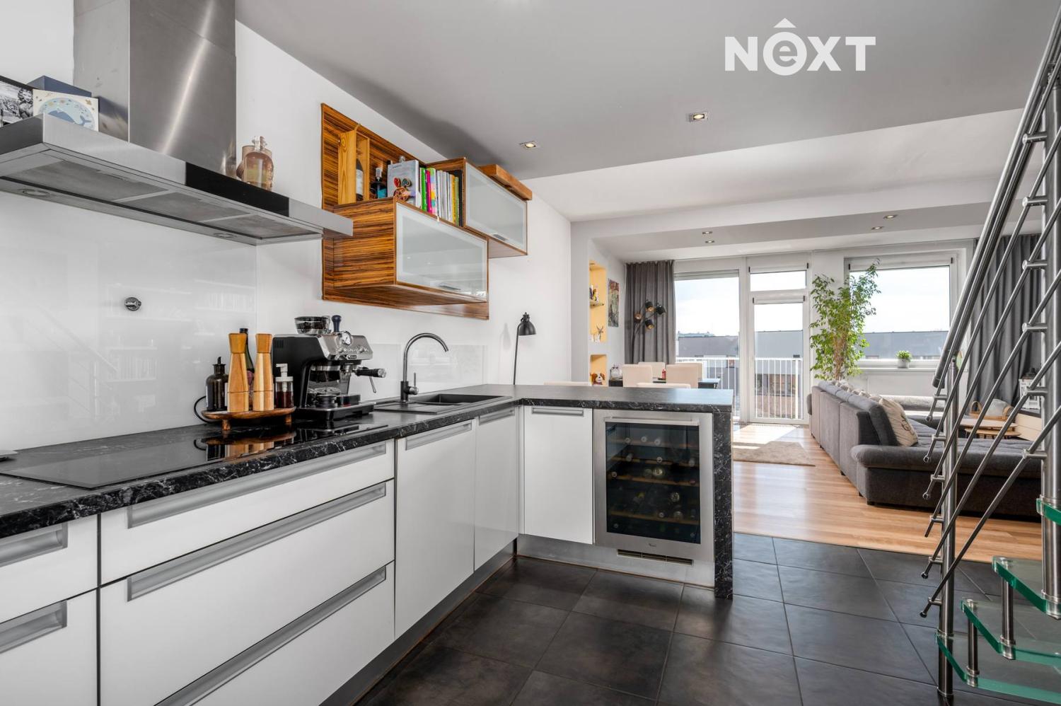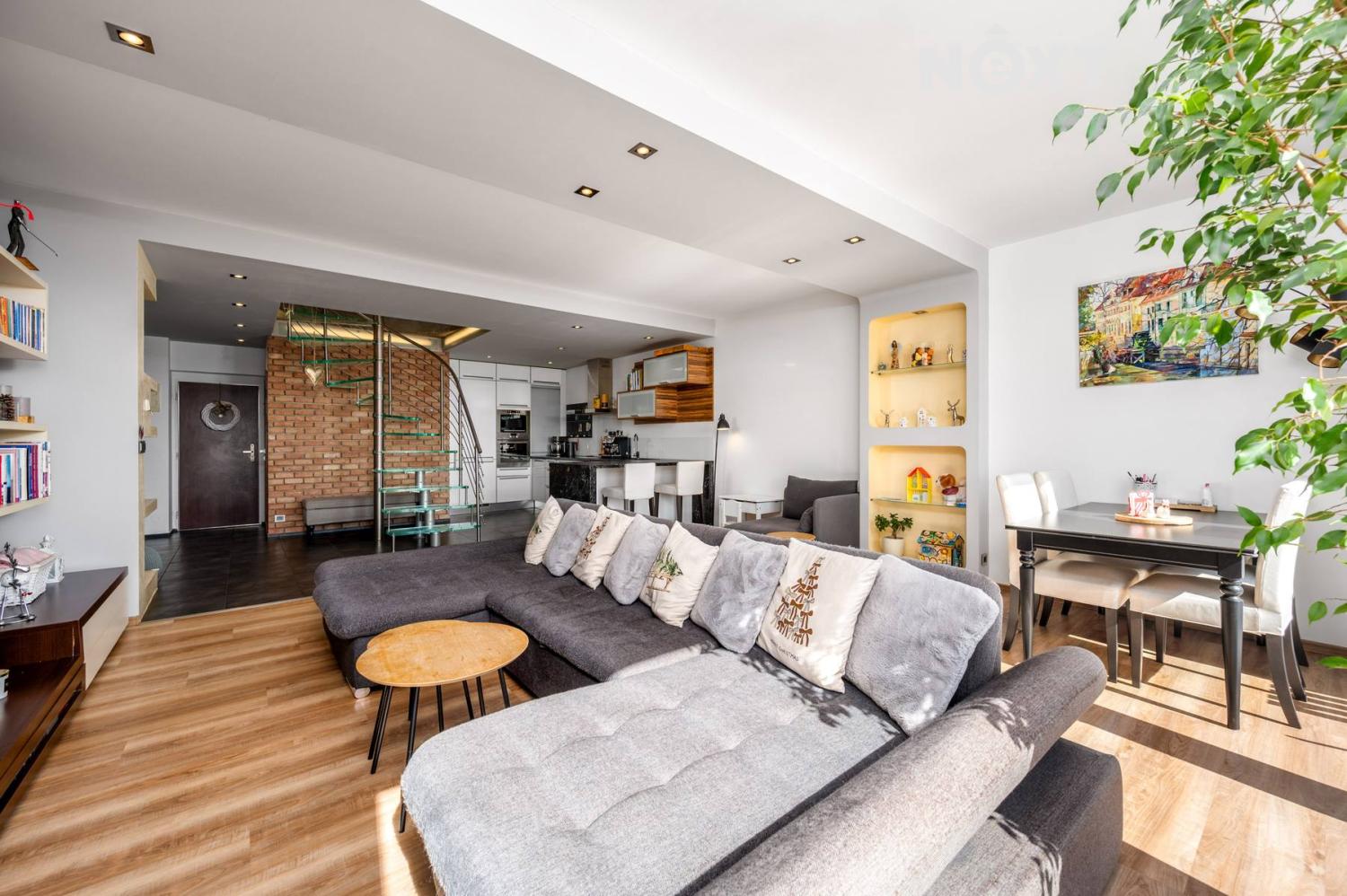 Dominantou bytu je velkorysý obývací pokoj s kuchyňským koutem o ploše 53 m², který dodává celému prostoru vzdušnost, dostatek přirozeného světla a zároveň vytváří příjemné místo pro každodenní život i setkávání s rodinou či přáteli. Mezonetové řešení přináší přirozené oddělení denní a klidové části, což zvyšuje komfort bydlení a pocit soukromí.