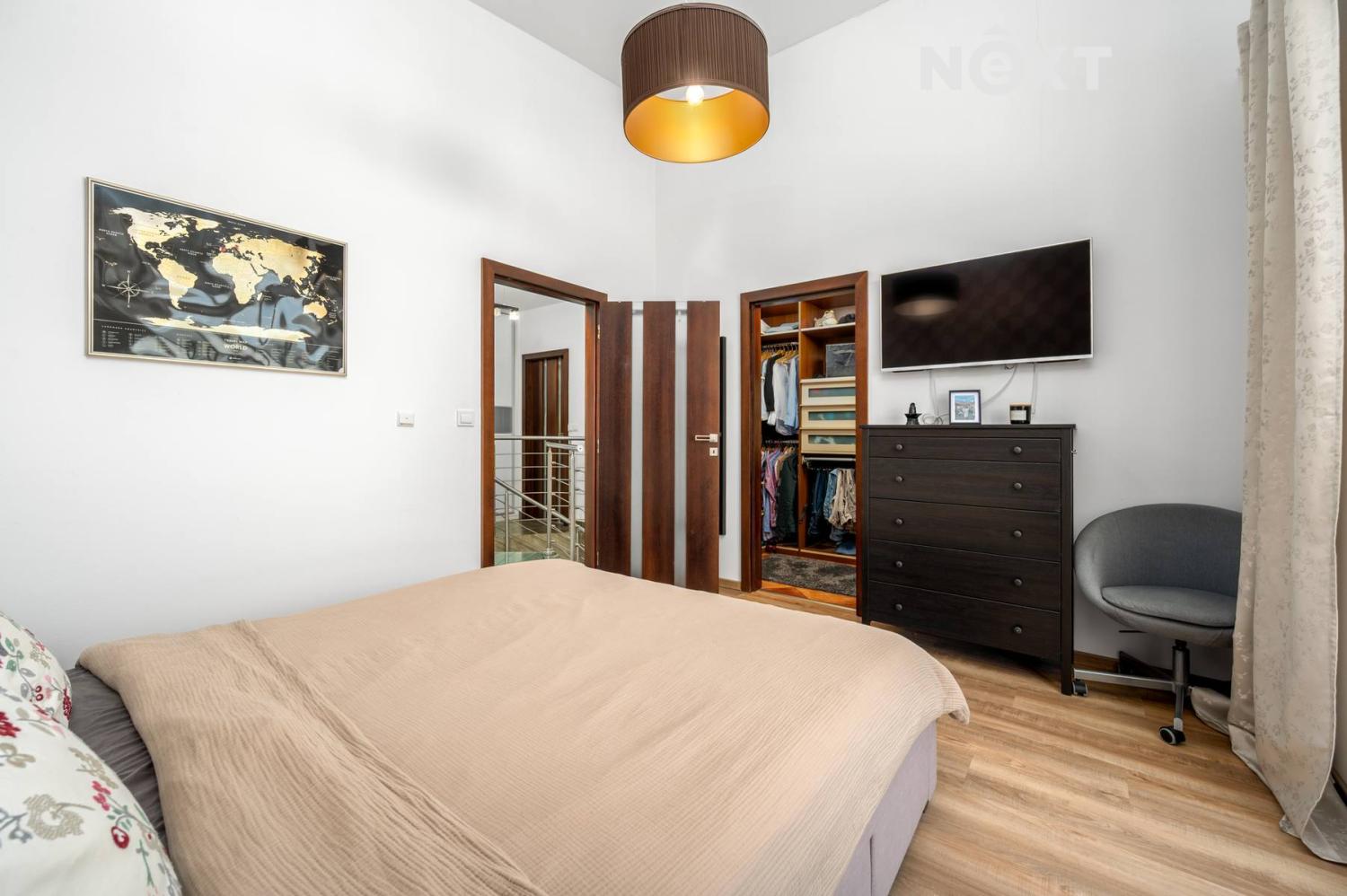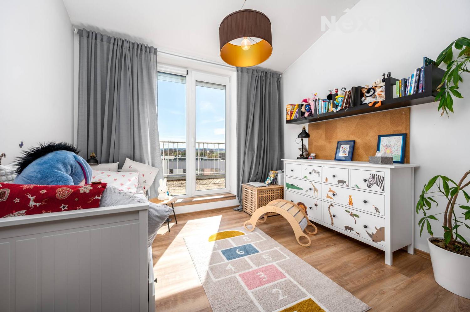 Horní patro bytu nabízí ložnici se vstupem na terasu, další pokoj vhodný jako dětský pokoj či pracovna, koupelnu, šatnu a halu s úložnými prostory. Dispozice je řešena prakticky a s důrazem na každodenní komfort.