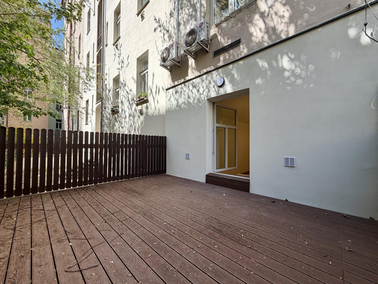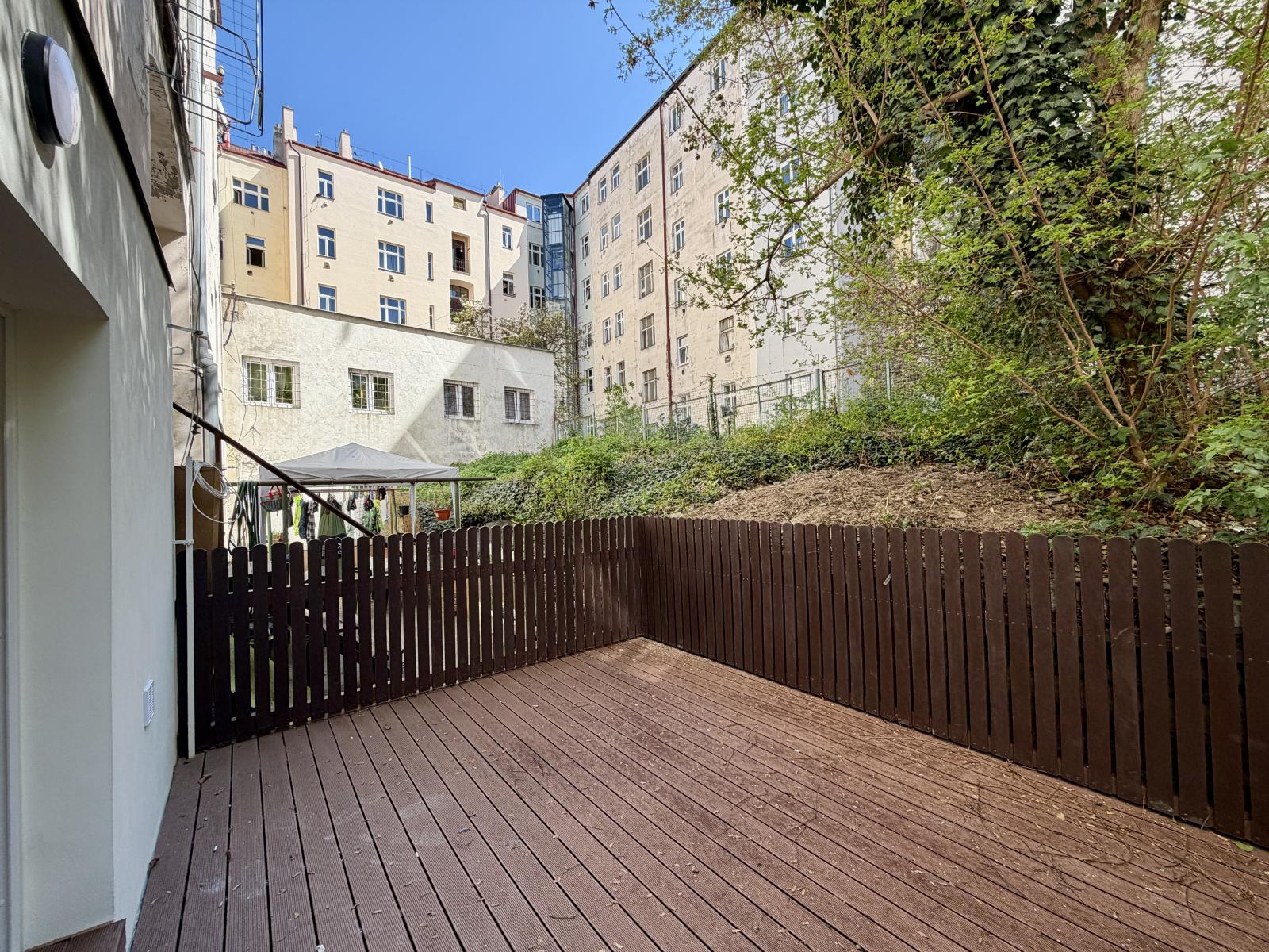 Velkým benefitem této nemovitosti je venkovní prostor zahrádka/terasa o velikosti cca 14m2 situovaná do klidného vnitrobloku. Ačkoliv je vedena jako společná část domu, je zde domluvené výlučné užívání, což zajišťuje dostatek soukromí. Do prostoru nemají přístup ostatní obyvatelé domu, okolní sousedé mají své části oddělené.