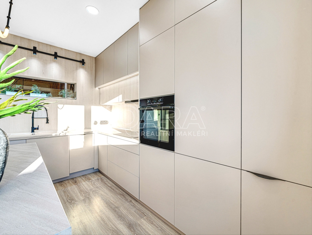 Interiér působí jako z designového magazínu. Kuchyňská linka na míru nabízí dostatek prostoru a je vybavena špičkovými spotřebiči.