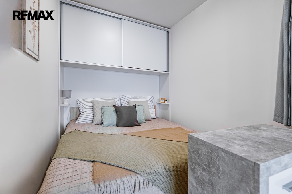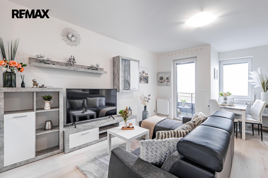 Interiér je připraven k okamžitému nastěhování bez dalších investic. V obývací části je pohodlný gauč, televizor (2 ks) a jídelní stůl. Ložnicová zóna nabízí manželskou postel a praktické úložné prvky. Kuchyňská linka s kvalitními spotřebiči AEG (trouba, varná deska, digestoř, myčka, lednice) je doplněna o kávovar, topinkovač a mixér značky MICAN. Koupelna je vybavena sprchovým koutem a pračkou se sušičkou. V předsíni potěší velká vestavěná skříň a botník, v bytě je dále menší komora a příjemná lodžie pro ranní kávu či večerní posezení.