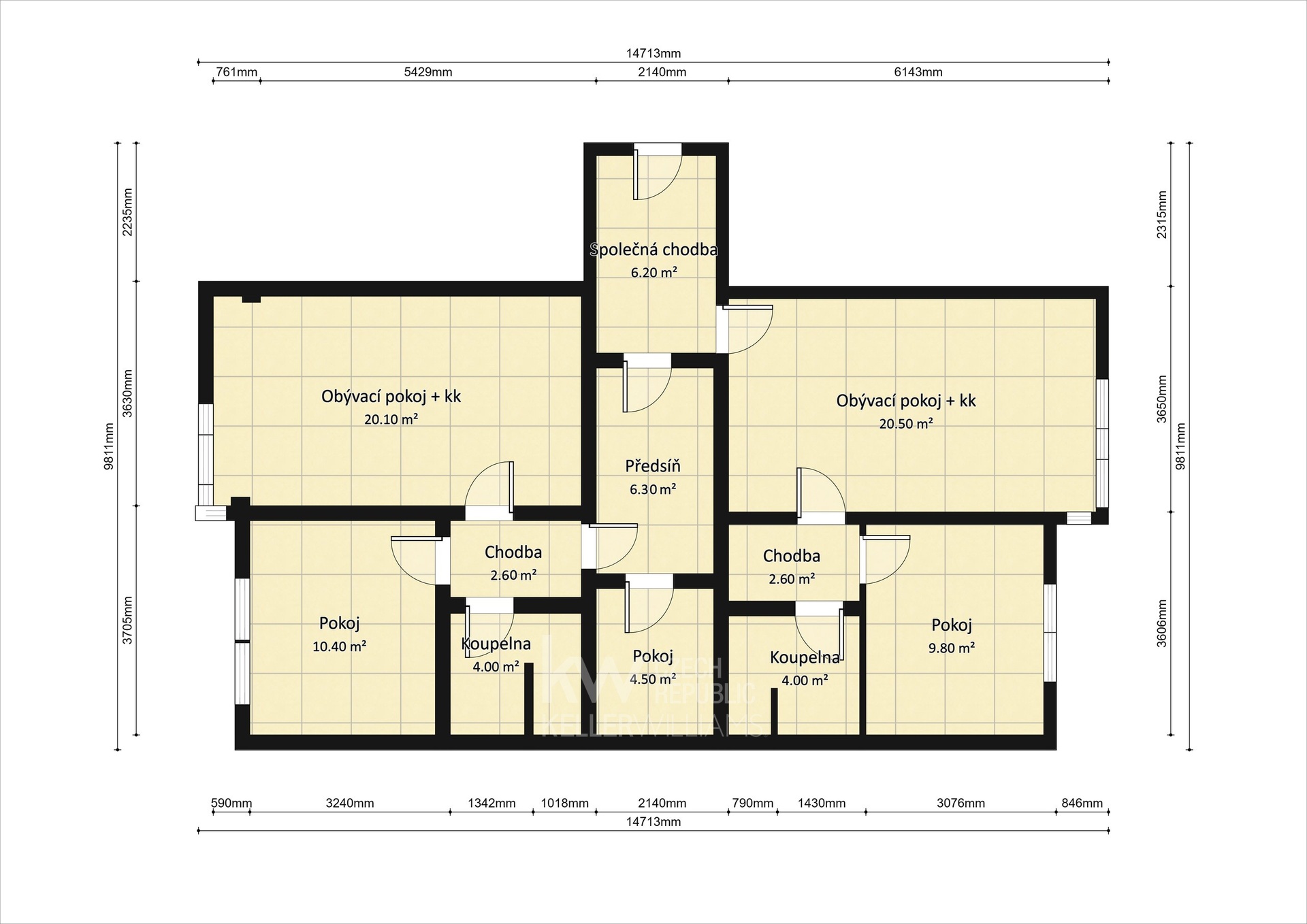 Dispozice nabízí předsíň, obývací pokoj s kuchyňským koutem, dva samostatné pokoje, chodbu a koupelnu s toaletou.