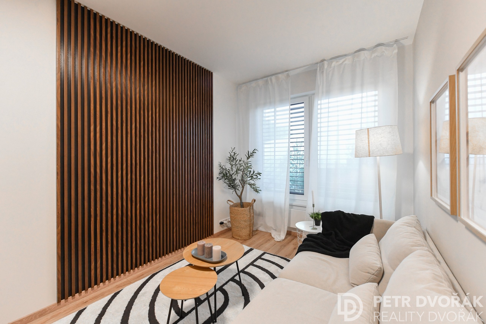 Dispozice bytu zahrnuje obývací pokoj s kuchyňským koutem, ložnici, koupelnu se sprchovým koutem a vstupní chodbu s technickou nikou, ve které je umístěna pračka. Součástí nabídky je sklepní kóje o výměře 4 m².