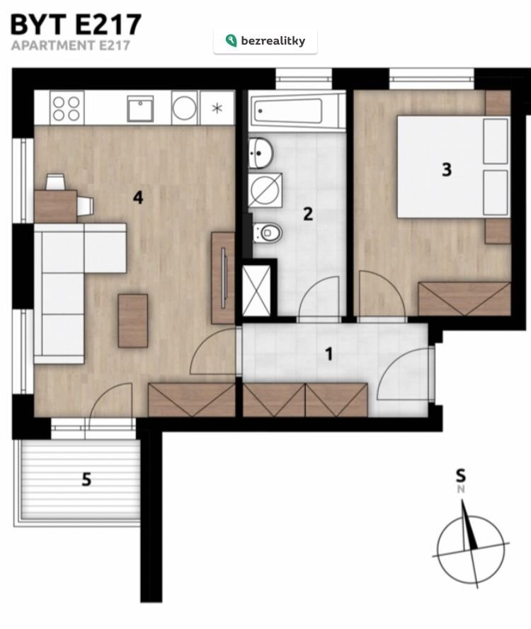 Byt ma rozlohu 45,4m2, je svetly, rohovy, orientovany na 3 svetove strany SJZ.