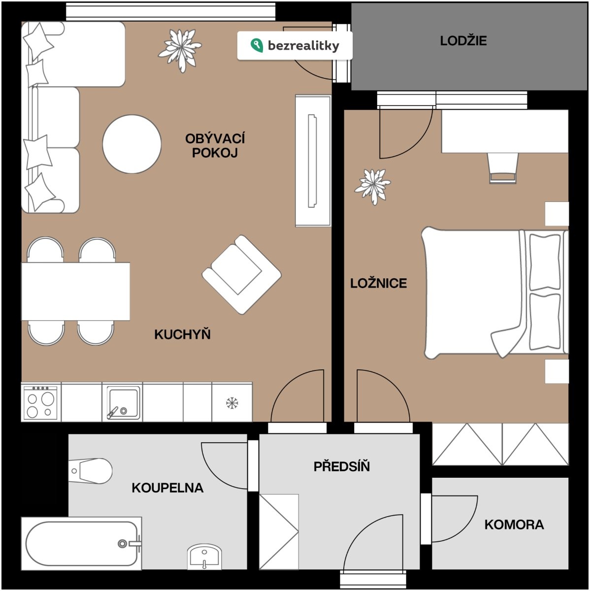 Dispozičně je byt řešen prakticky a účelně. Tvoří jej obývací pokoj s kuchyňským koutem, samostatná ložnice, koupelna s vanou a toaletou a vstupní předsíň. Součástí bytu je také komora umístěná přímo v jednotce, která poskytuje dostatek úložného prostoru.