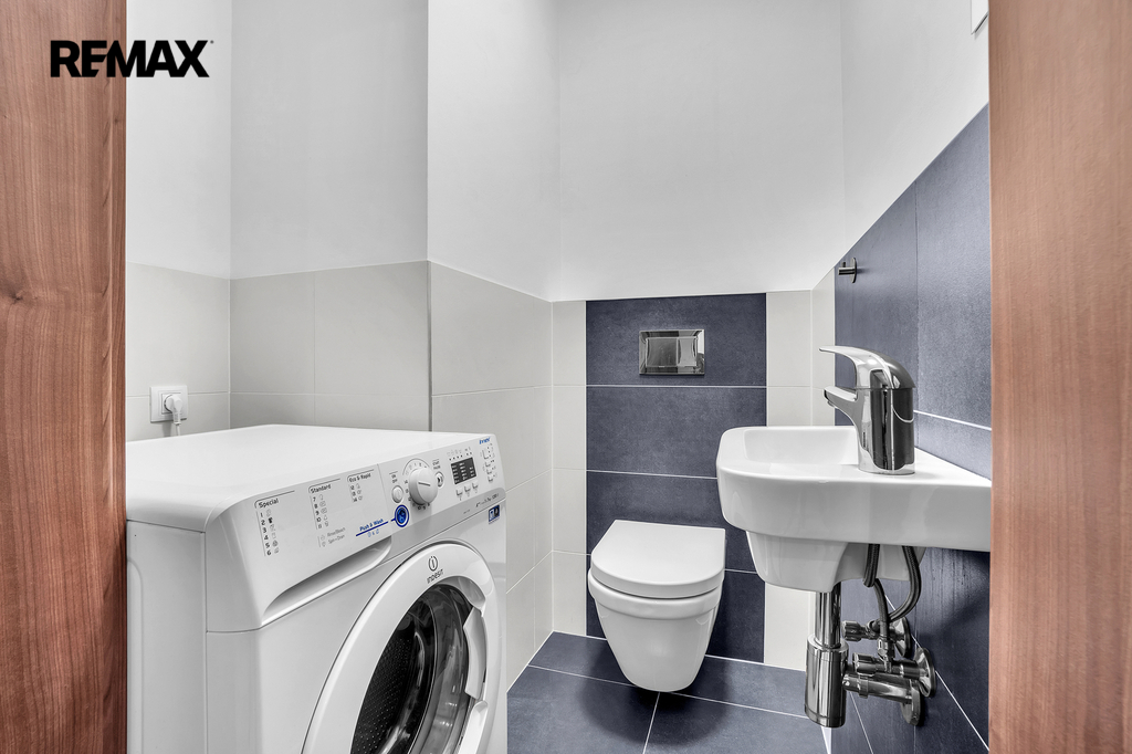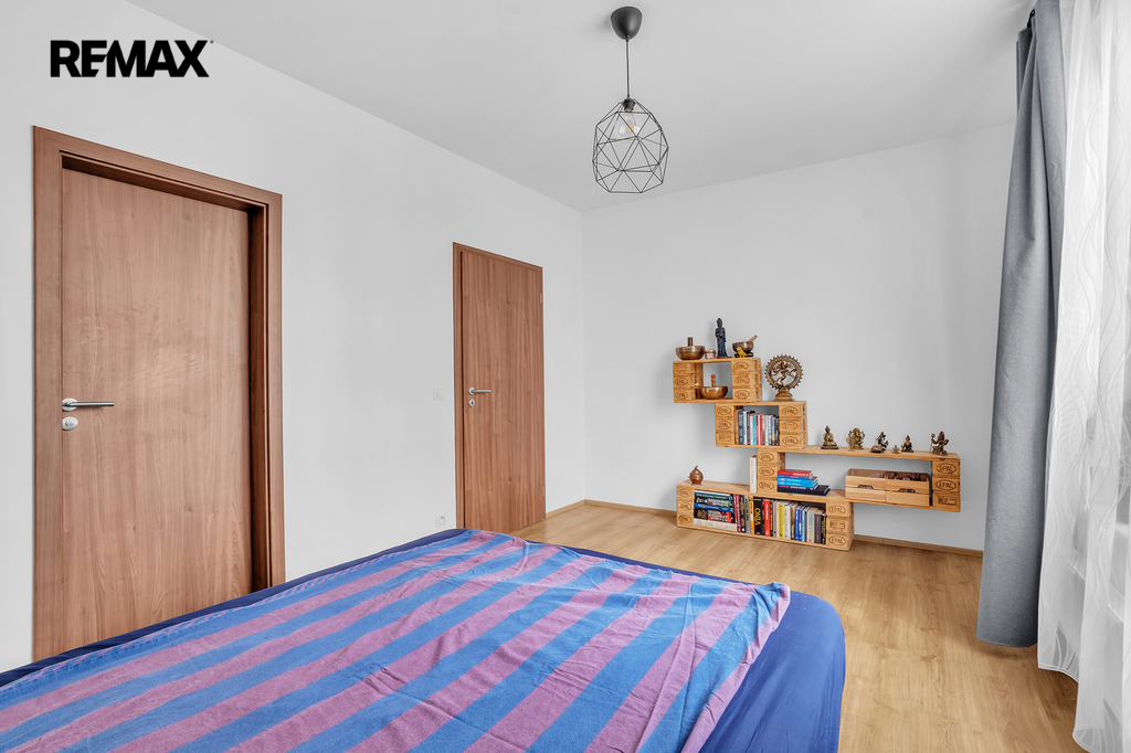 Na bytě oceníte především jeho příjemnou světlost, praktickou dispozici a velikost jednotlivých pokojů. Předsíň je vybavená na míru stavěnou velkorysou šatní skříni, která zároveň nabízí mnoho úložného prostoru a také velké zrcadlo. Obývací pokoj s kuchyňskou linkou nabízí vstup na balkon. Kuchyňská linka je vybavená spotřebiči (vestavena kombinovaná chladnička, indukční deska, elektrická horkovzdušná trouba, myčka nádobí, digestoř). Ložnice má přímý vstup do hlavní koupelny s toaletou. Byt dále disponuje druhou toaletou přístupnou z předsíně. Ta poslouží nejen návštěvám, které nemusí vstupovat do hlavní koupelny, nabízí také další úložné prostory a místo pro pračku se sušičkou.