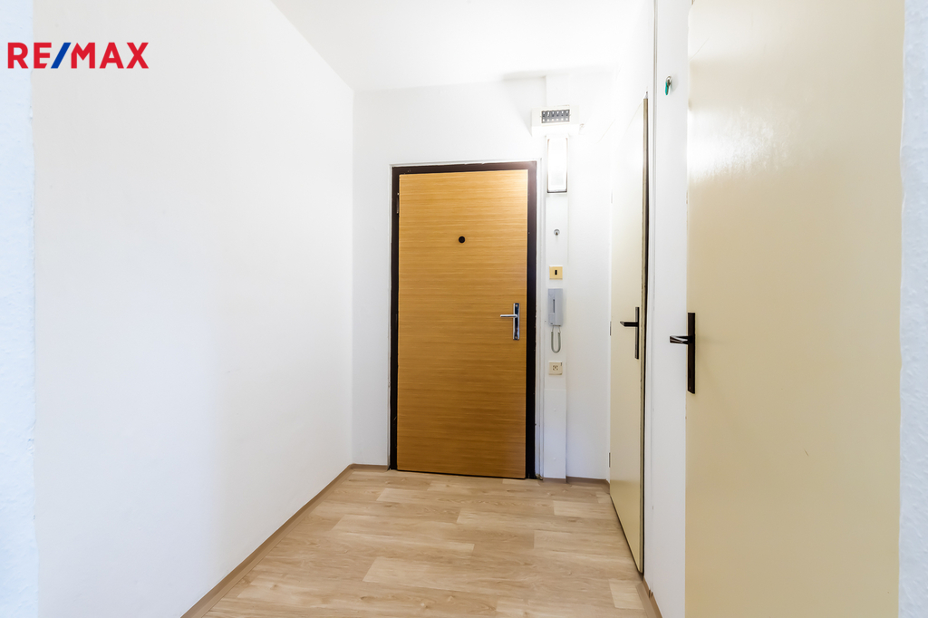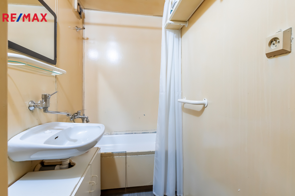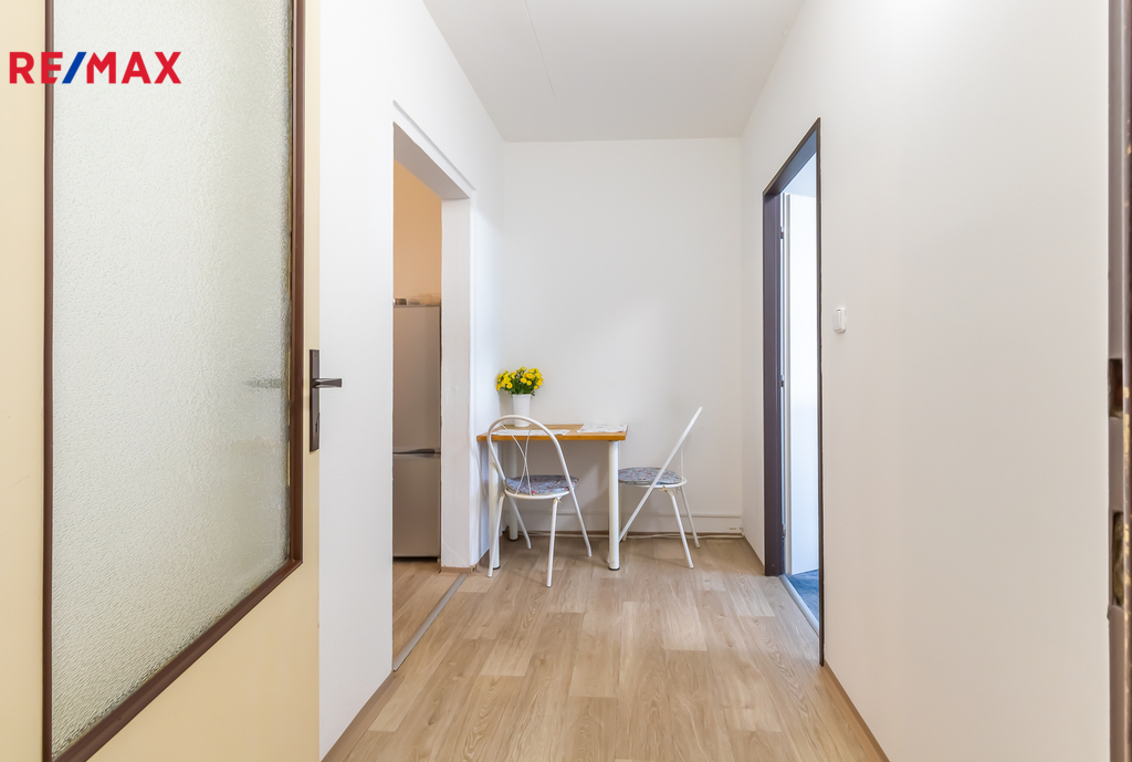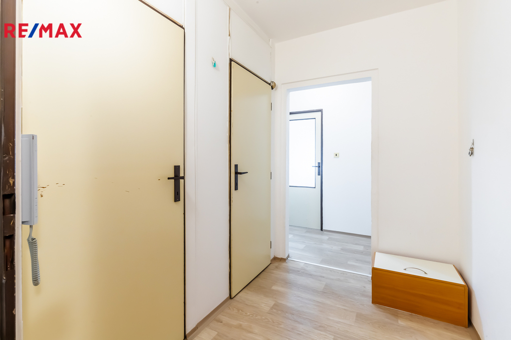 V současné době je původní dispozice 2+kk upravena lehkou příčkou na 2+1, tak že obývací pokoj je samostatným pokojem a kuchyňský kout je zvlášť. Kuchyňský kout je vyřešen velmi prakticky, díky čtvercového půdorysu nabízí možnosti řešení kuchyňské linky do tvaru L nebo U. Byt je udržovaný, v původním stavu, koupelna a wc v umakartovém jádře, wc samostané. Na podlahách linoleum a koberce. Okna plastová. K bytu patří i právo užívání společného balkonu pro 4 byty, přístupného ze společné chodby.