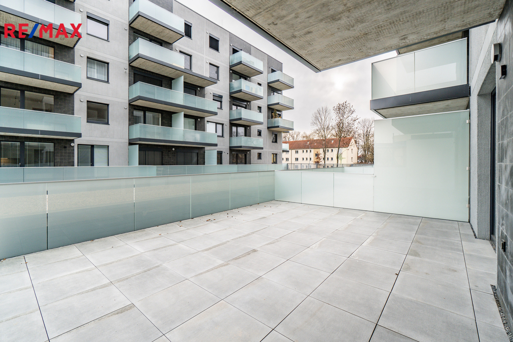 Byt je umístěn v 1.NP s výhledem do vnitrobloku. Budova má v úrovni terénu garážová stání a nad nimi je teprve 1.NP, tedy v jiné budově by označení podlaží bytu bylo v 2.NP.