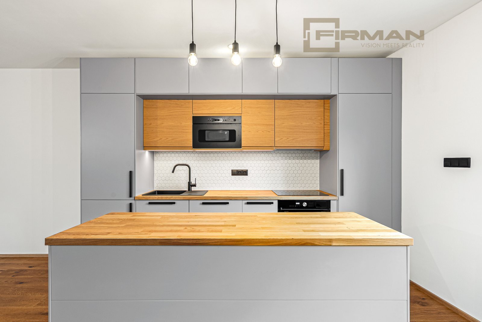 Kvalitní dubová olejovaná podlaha, pečlivě zvolené prvky v koupelně včetně mramorových detailů a celkové řemeslné provedení dodávají bytu charakter, který nepodléhá času.