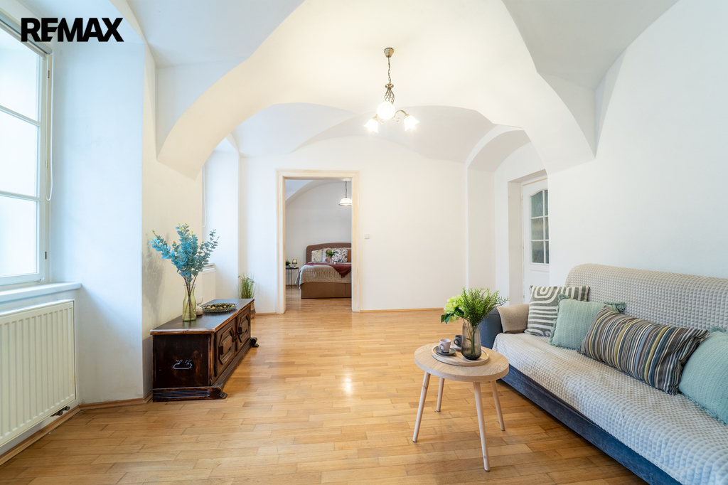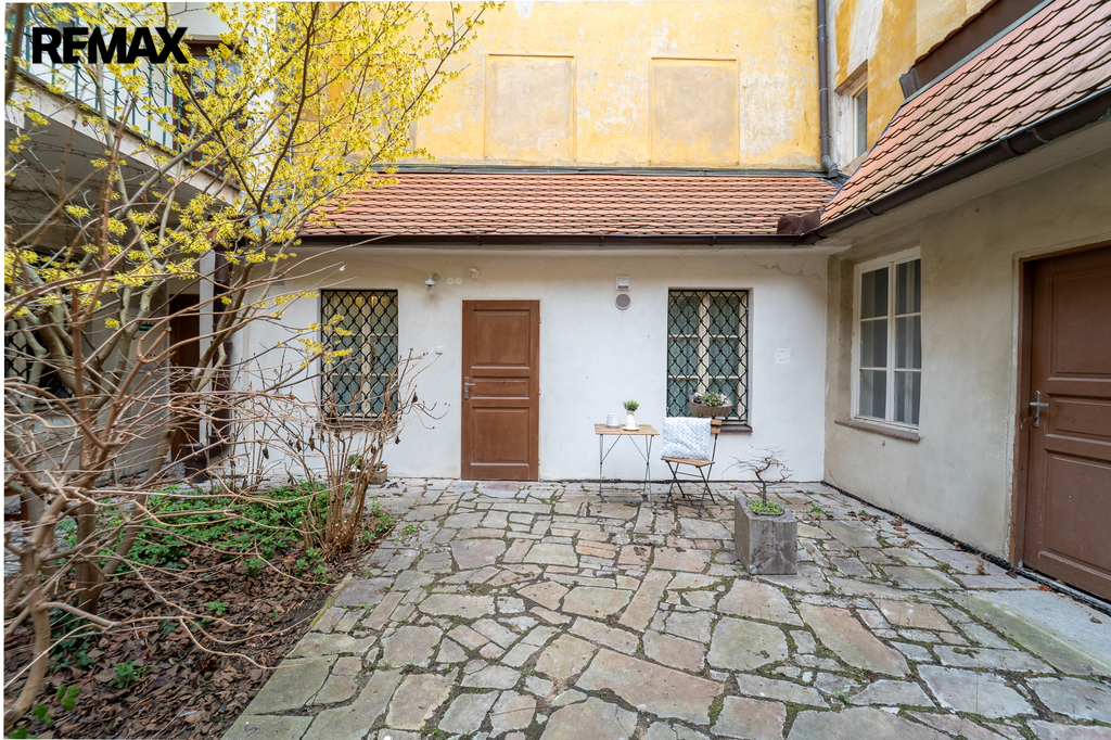 Velkou předností bytu je také přímý vstup do klidného vnitrobloku domu, kde je možné využívat příjemné posezení, ideální pro relaxaci či trávení času v soukromí mimo ruch historického centra.