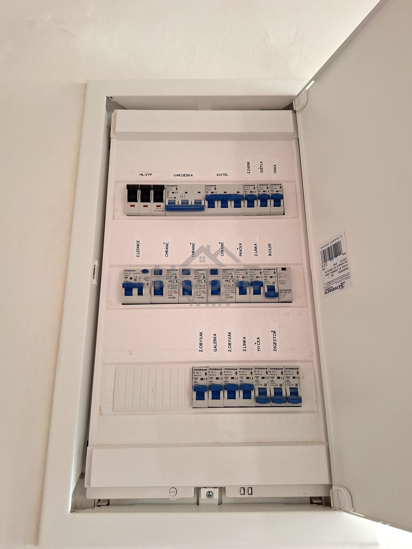 Nové elektroinstalace včetně pojistkové skříně a zásuvek.