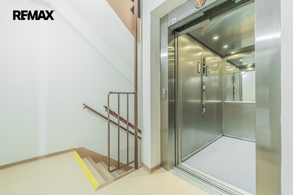 Byt se nachází v 5. patře s výtahem. K bytu náleží sklep a dále je v domě k dispozici kočárkárna a kolárna.