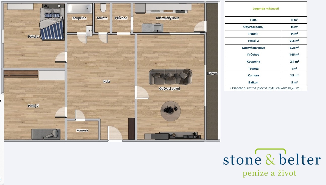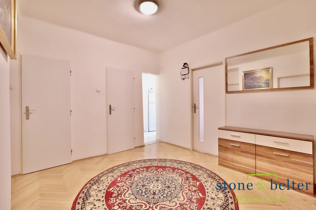 Dispozice bytu nabízí neprůchozí pokoje, což zajišťuje dostatek soukromí pro jednotlivé členy domácnosti. Součástí bytu je také velká komora, která poskytuje praktický úložný prostor přímo v bytě.