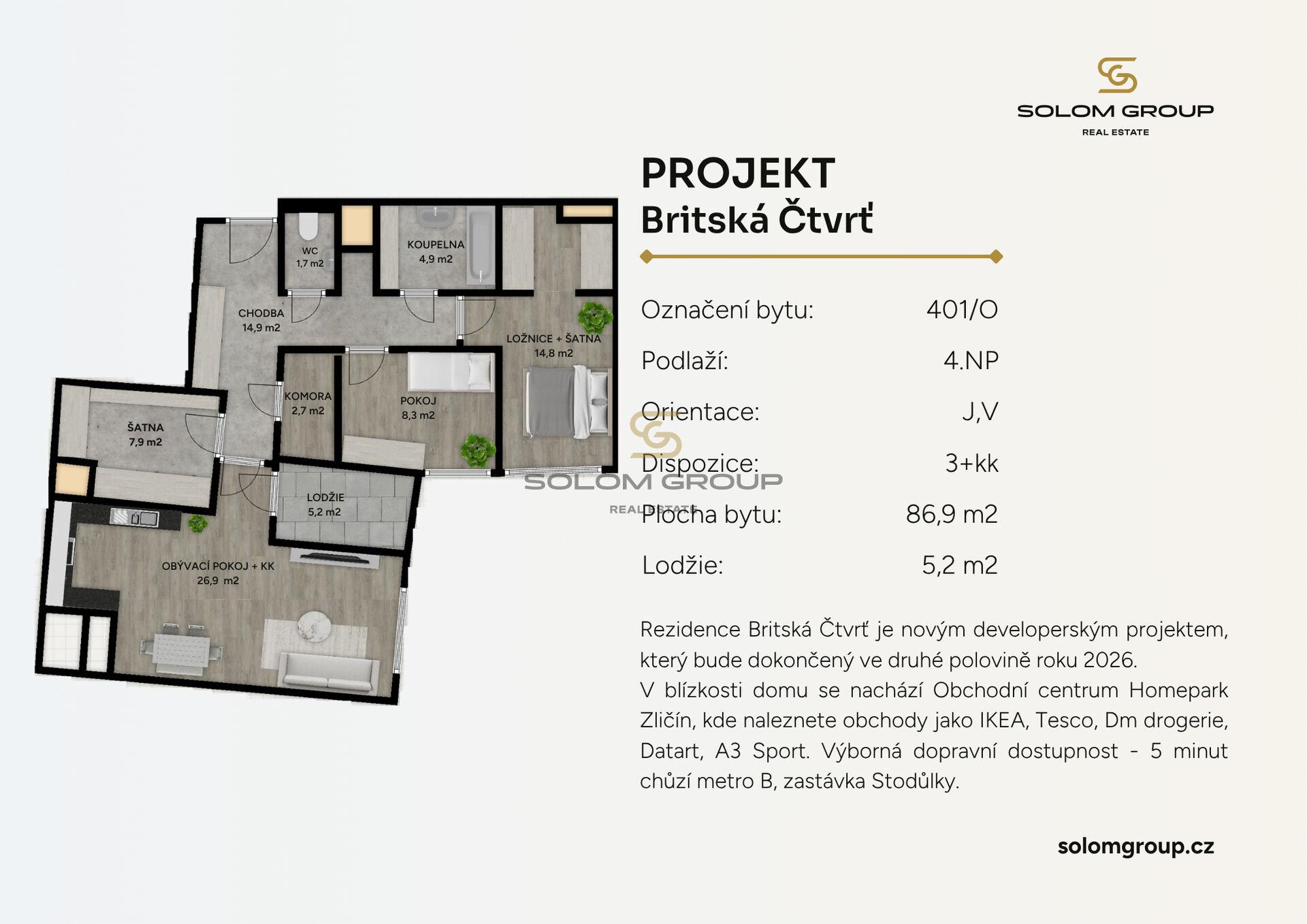 Prodej nového bytu 3+kk o výměře 86,9 m² s lodžií 5,2 m², který se nachází ve 4. NP cihlové novostavby v Rezidenci Britská čtvrť, Praha 12 – Stodůlky.