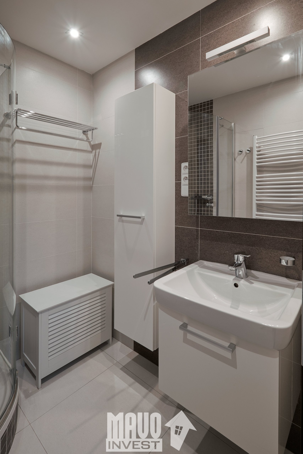 Dispozice bytu je prakticky řešená – dominantu tvoří světlý obývací pokoj s kuchyňským koutem a jídelní částí. Kuchyň je plně vybavená a díky barovému pultu přirozeně odděluje pracovní a obytnou zónu. Interiér působí čistě, moderně a je připravený k okamžitému nastěhování bez nutnosti dalších investic.