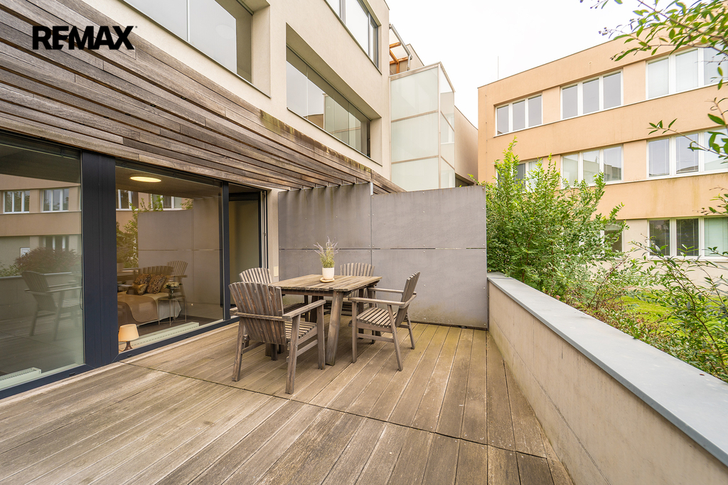 Nabízíme Vám ke koupi bytovou jednotku v perfektním stavu o celkové užitné ploše 65,6 m2 + soukromá předzahrádka o velikosti 29m2 + uzavřená terasa o velikosti 19,1 m2 + sklepní kóje 0,8 m2 a privátní garážové parkovací stání s vlastním vchodem do bytu přes předzahrádku. Byt, nacházející se v 1. nadzemním podlaží skeletového domu, se skládá z obývacího pokoje s kuchyňským koutem se vstupem na předzahrádku, dvou ložnic se vstupem na terasu, předsíně, koupelny, toalety a chodby.