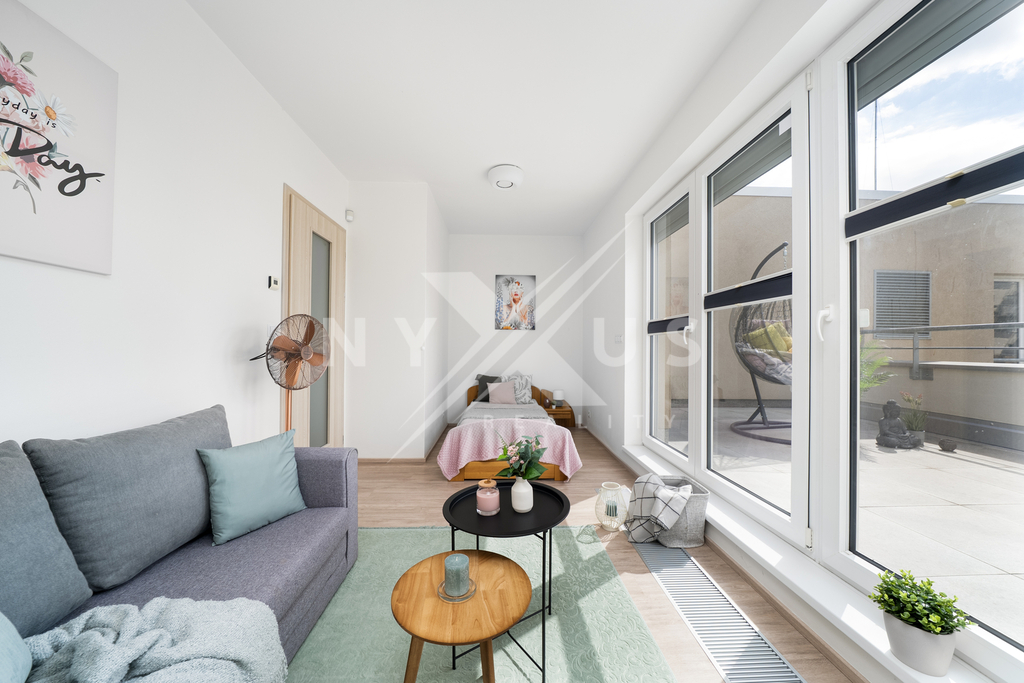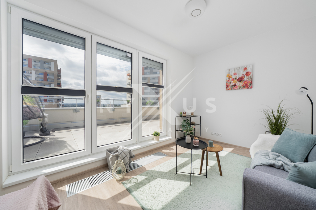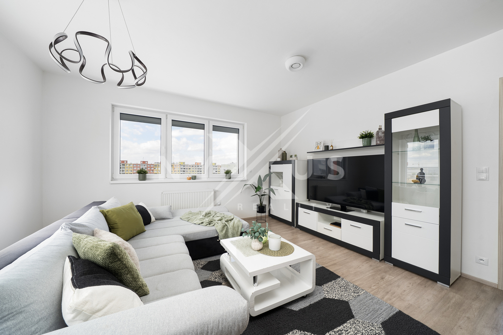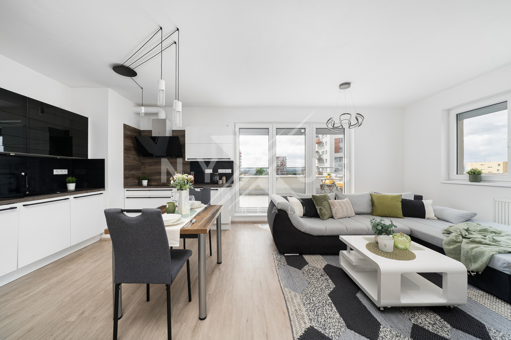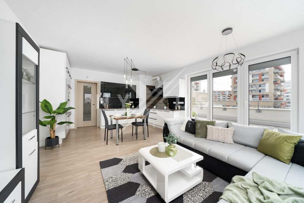 Dominantou bytu je prostorný obývací pokoj s kuchyňským koutem a přímým vstupem na terasu, která propojuje interiér s exteriérem. K dispozici jsou také tři ložnice, dvě koupelny a dvě toalety. První koupelna je vybavena sprchovým koutem a toaletou, druhá koupelna nabízí vanu, toaleta je řešena samostatně. Vstupní hala poskytuje dostatek prostoru a komfortu.