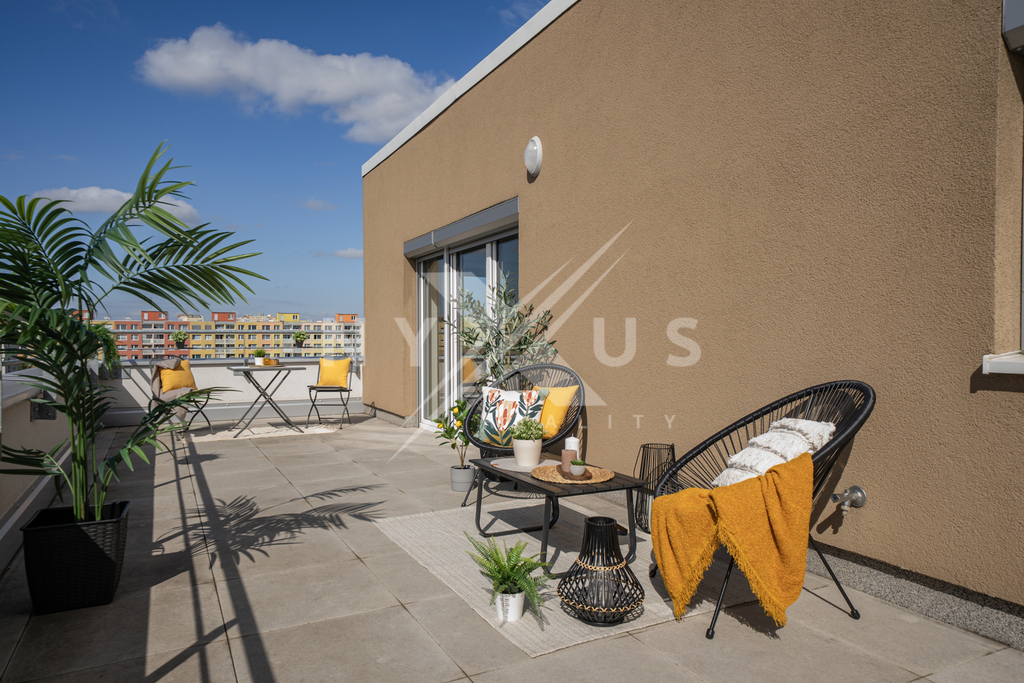 Prodej bytu 4+kk - 112 m² + terasa 46 m², dvě garážová stání, Mantovská, Praha 10 - Horní Měcholupy