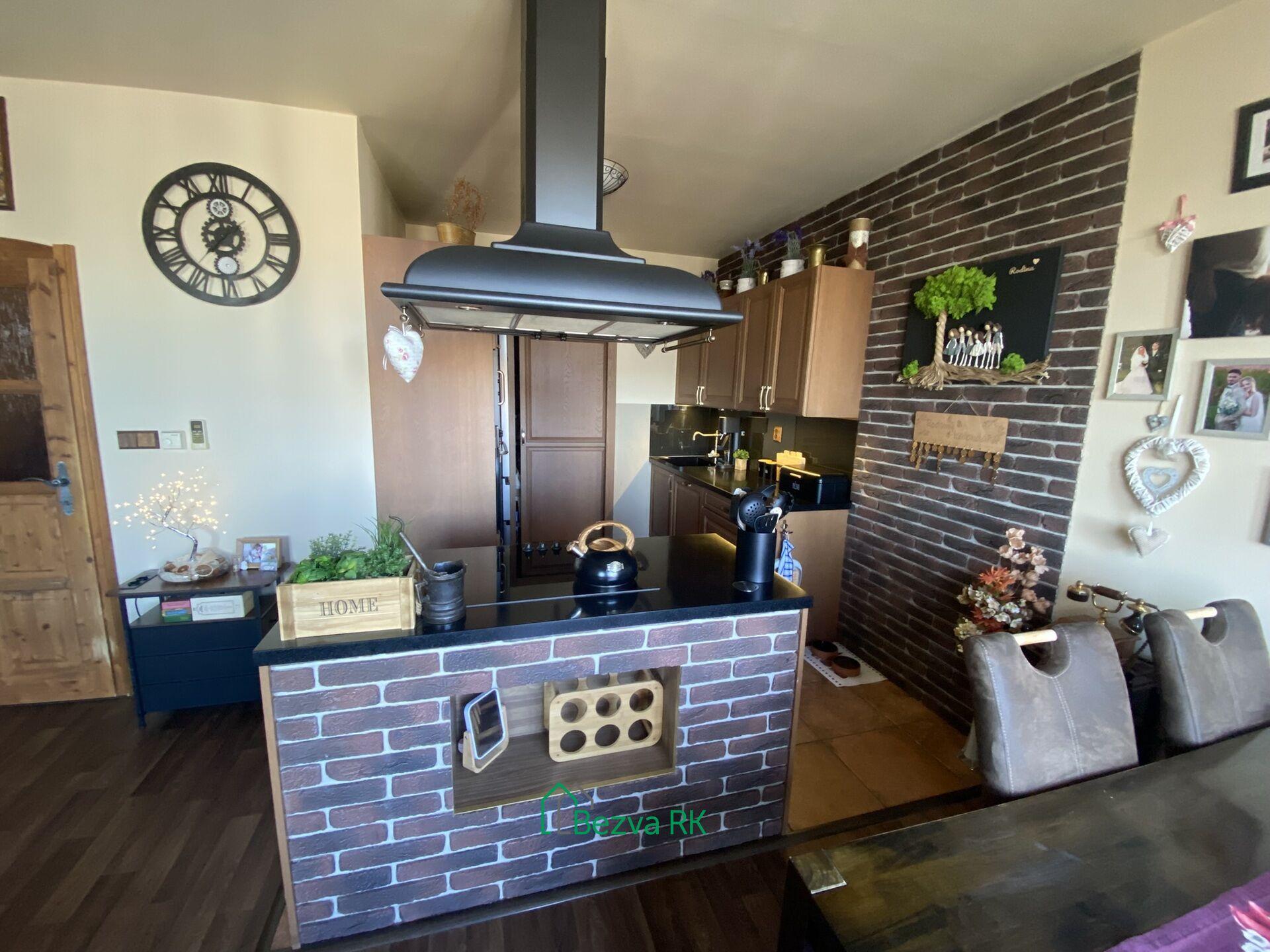Srdcem bytu je spodní patro, kde se rodinný život odehrává v prosvětleném obývacím pokoji s kuchyňským koutem v poctivém dřevěném dekoru, který dodává prostoru hřejivý nádech a klid. Z obývacího pokoje můžete vyjít na balkon (8 m²), který je jako stvořený pro ranní rituály s šálkem kávy při východu slunce. Praktické zázemí doplňuje samostatné WC.