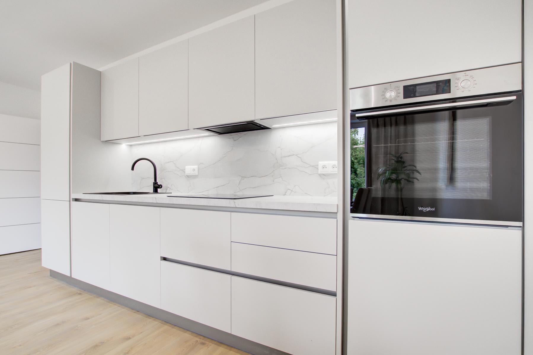 Kuchyňská linka Lube (Itálie) s matným povrchem odolným proti otiskům je vybavena spotřebiči Whirlpool (indukce, trouba, myčka, digestoř, lednice s mrazákem).