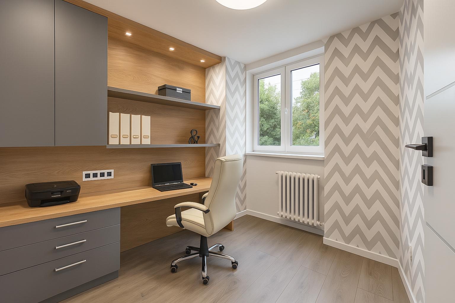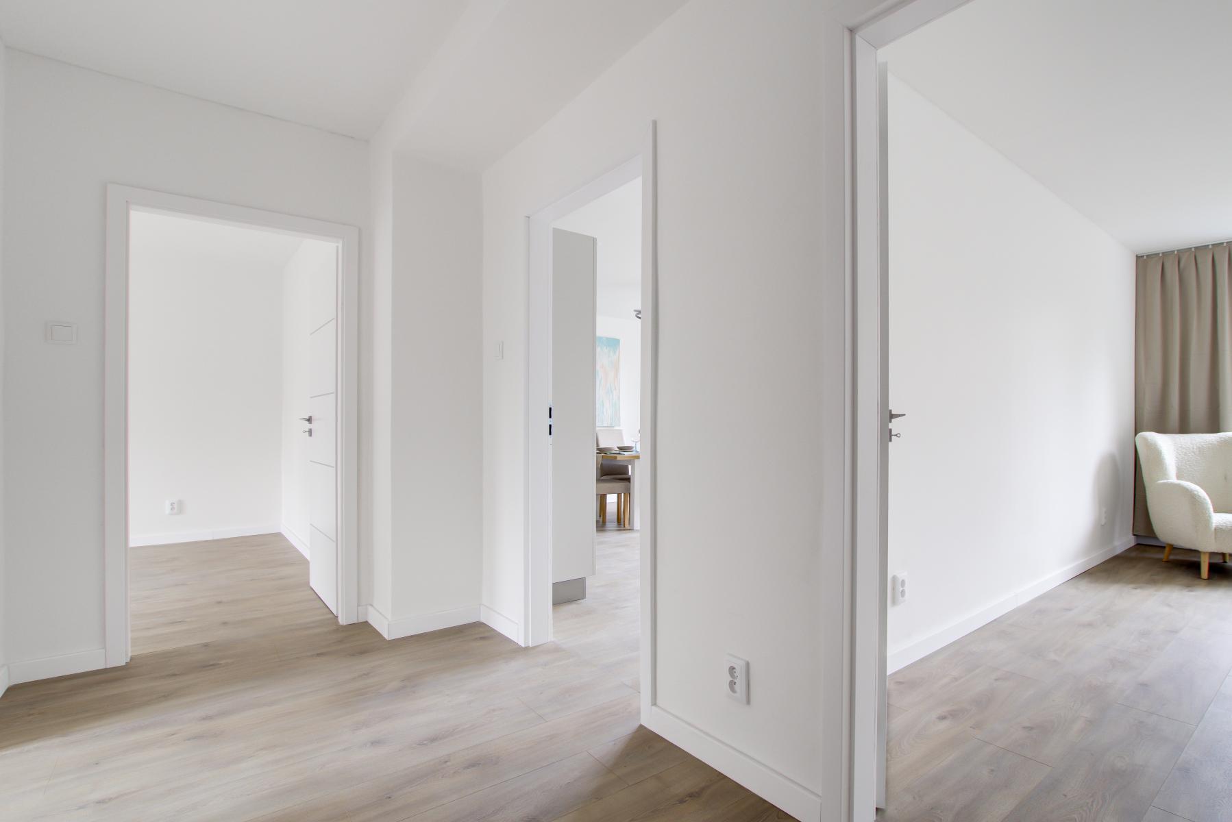 Dispozice je velmi praktická: obývací pokoj s kuchyňským koutem, dvě prstorné ložnice, dětský pokoj nebo pracovna, koupelna a samostatná chodba. Všechny místnosti jsou neprůchozí.