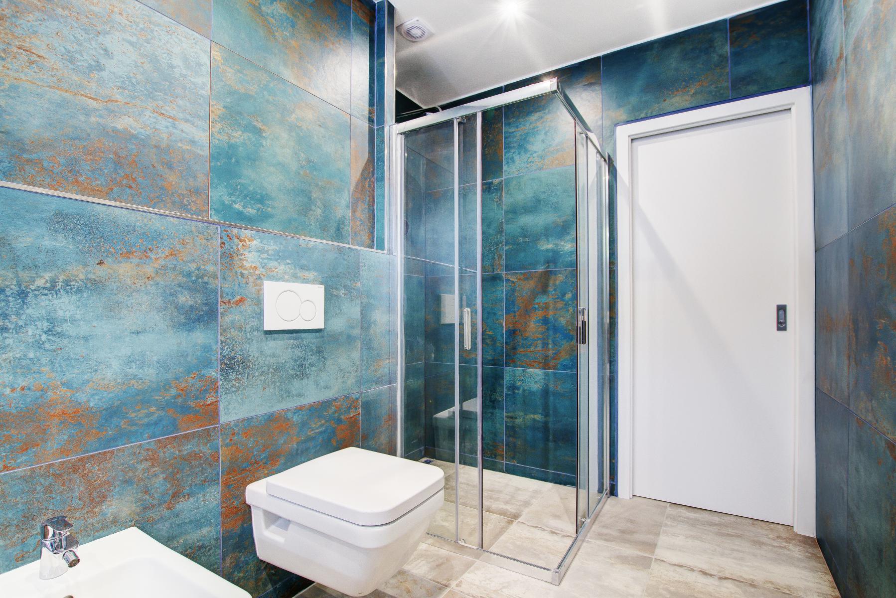 Moderní koupelna: podlahové topení, sprchový kout, WC, bidet, příprava na pračku a sušičku. Použity prémiové materiály (Villeroy and Boch, Grohe, italské obklady).